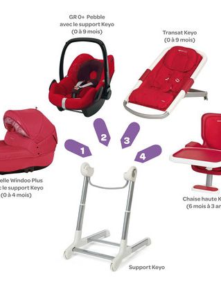 Le concept Keyo est une solution unique et évolutive pour allonger et asseoir son enfant de la naissance à 3 ans toujours à la bonne hauteur. En effet le support modulaire Keyo possède des attaches modulo clip permettant d’installer une nacelle, un Gr.0+, un transat puis une assise de chaise. Il devient tour à tour petit lit, transat ou chaise haute. Le support est réglable en hauteur et facilement déplaçable grâce à ses 2 roues intégrées.