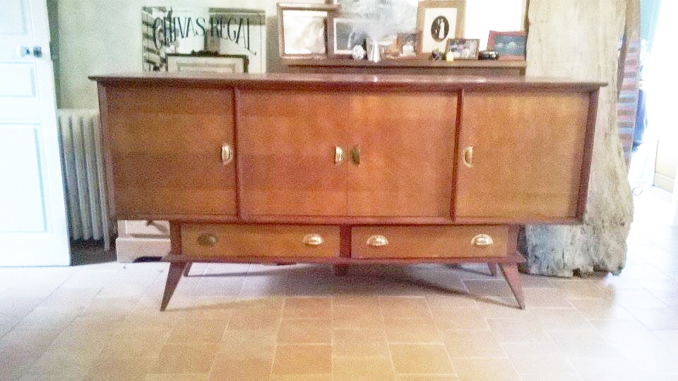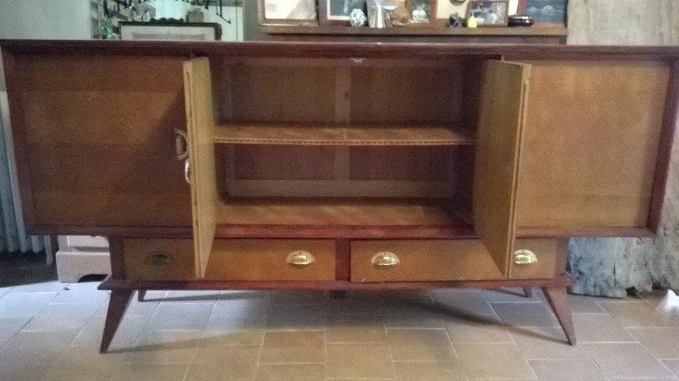 Grande enfilade des années 50. En très très bon état mais quelques imperfections sur la marqueterie quand même ! le bois peut être poncé pour montrer toute la beauté du chêne clair blond. long 2 mètre 05,largeur 53 centimètre, hauteur 1 mètre 02. en deux partie le haut est pausé sur la partie tiroir. il manque une étagère de côté.