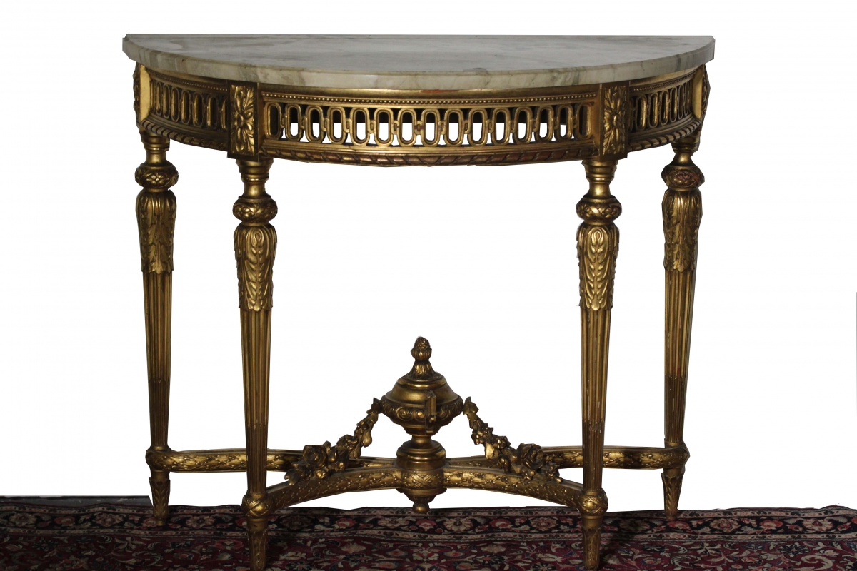 Console demi lune en bois doré à ceinture ajourée d'entrelacs oblongs.