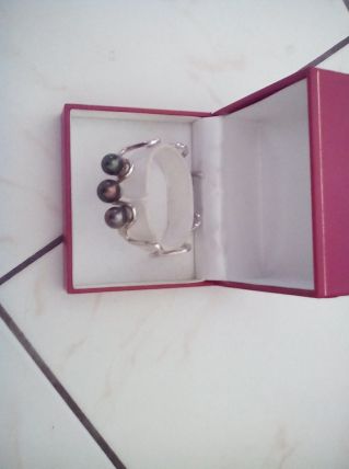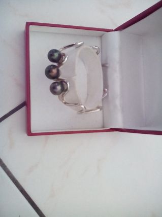 Jonc réglable en argent avec trois perles de tahiti.couleurs des perles aubergine et verte. Bracelet acheté à moorea Pearl disign. comme neuf porté deux fois