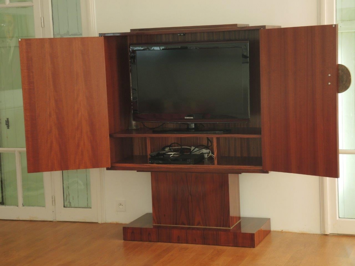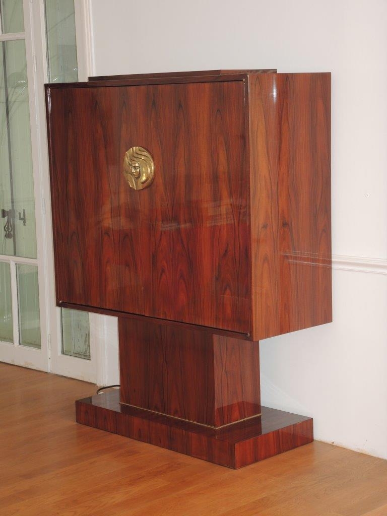 Magnifique meuble enfilade Art et Déco "1930" en palissandre de Rio, vernis tampon, médaillon bronze, pouvant servir de bar, rangement ou également meuble de télévision (jusqu'à 118 cm de large) etc.. Meuble fabriqué par ébéniste d'art à Paris.
