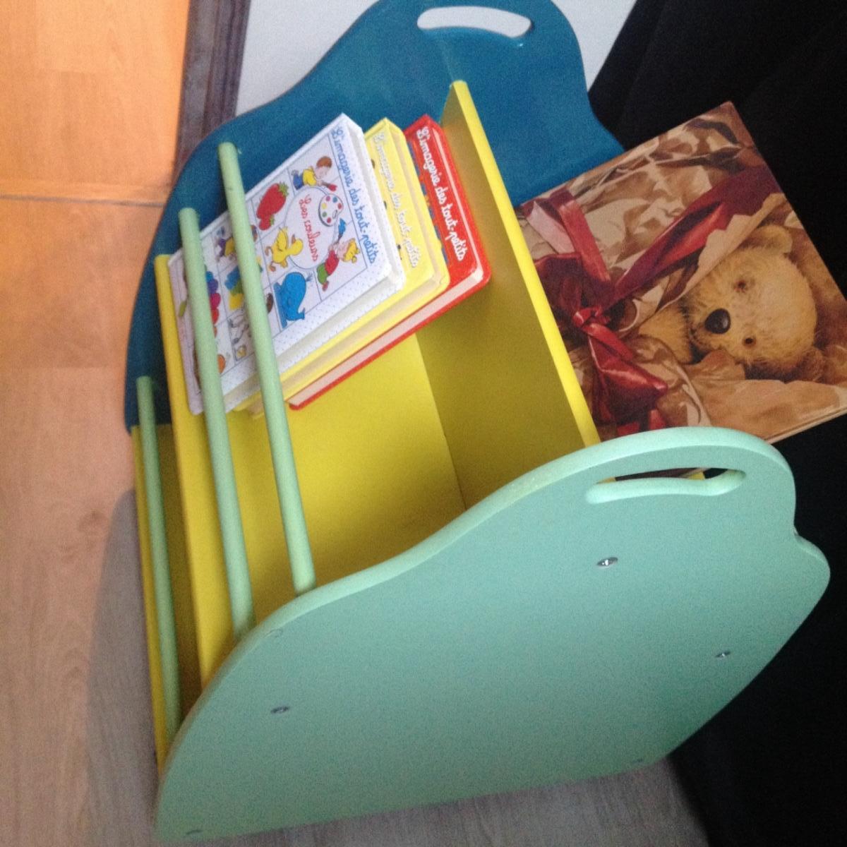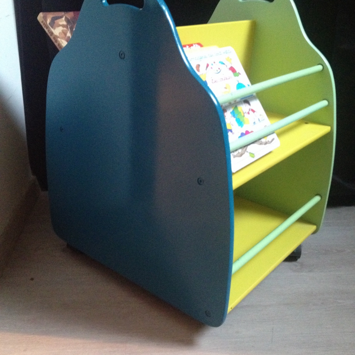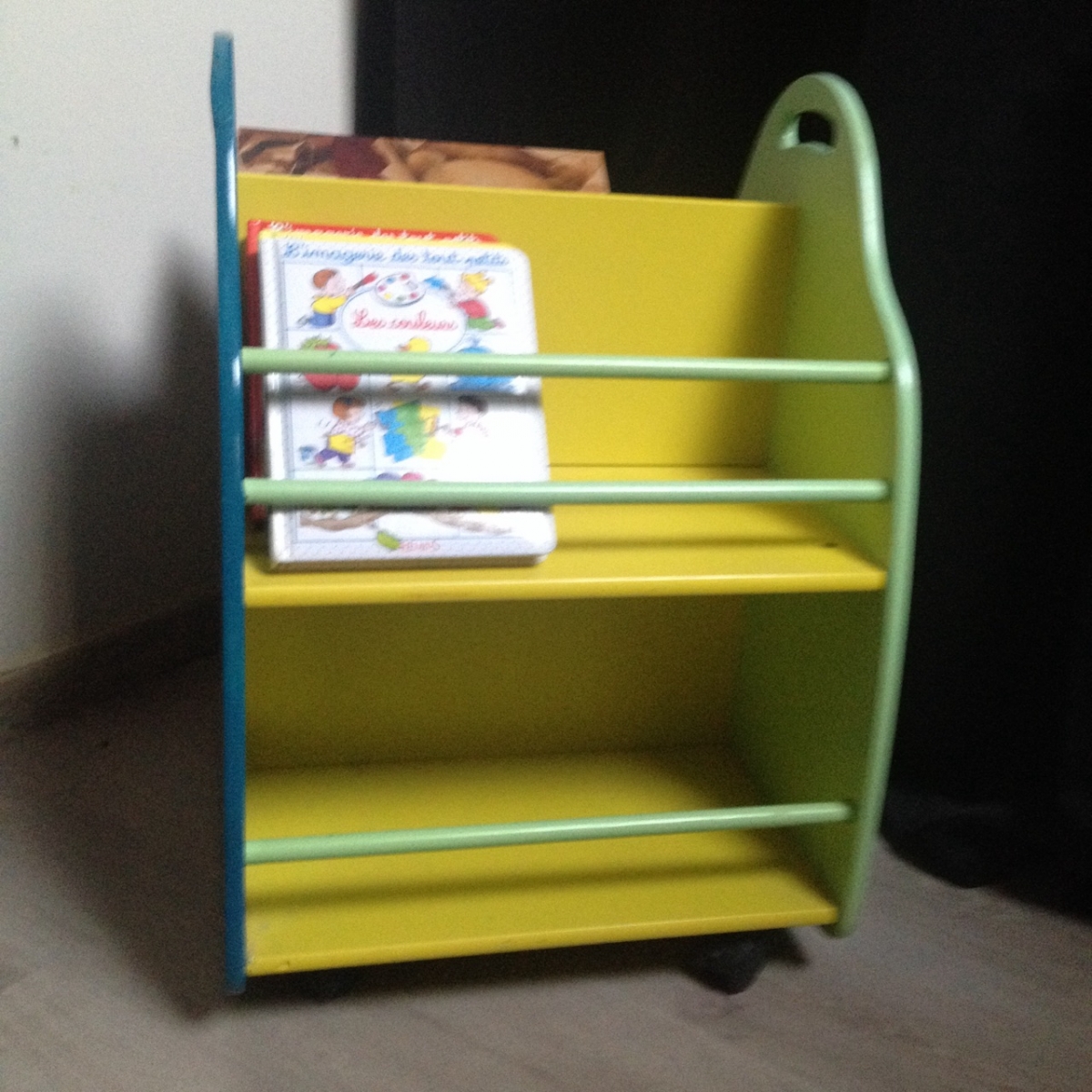 Jolie bibliothèque pour enfants à roulettes, intacte, peinture impeccable. (tricolore).