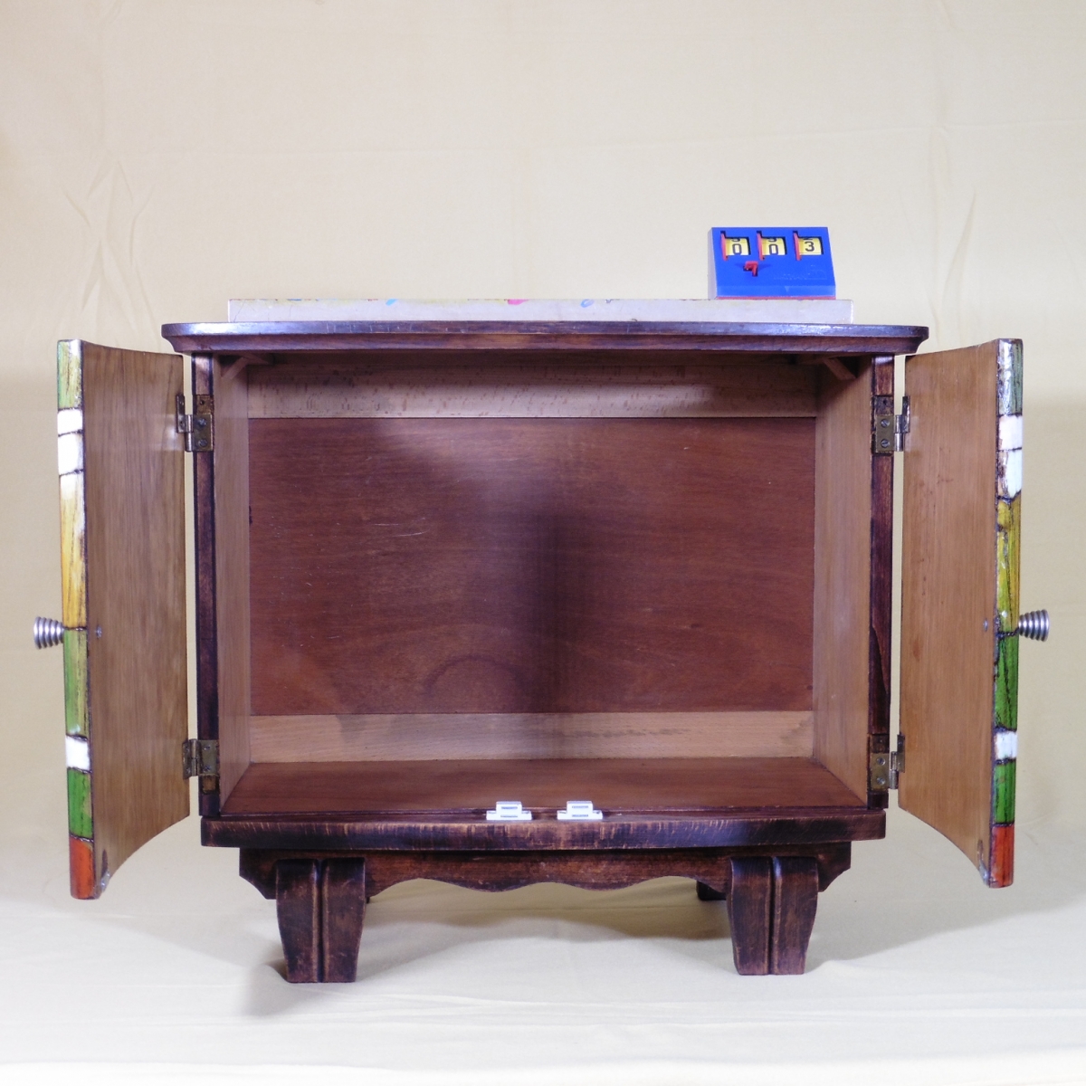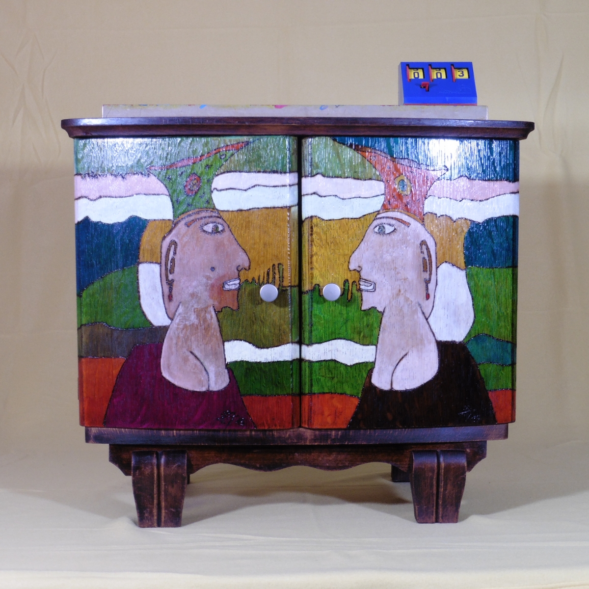 Table de chevet style art-déco, les portes représentent deux magiciens, pyrogravure, peinture, vernis, inspirée du village de Norrent-Fontes, œuvre unique, signée le Magicien Pyrograveur.