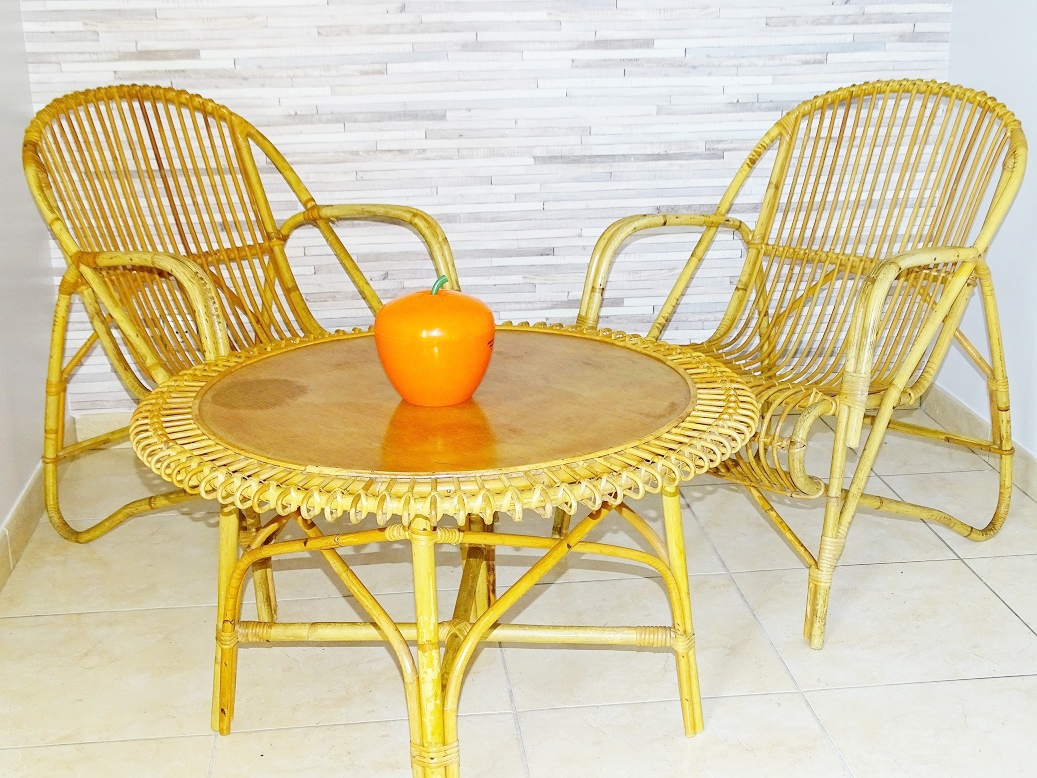 La table soleil est en rotin et en bambou et date des années 60. Aucun manque de rotin.