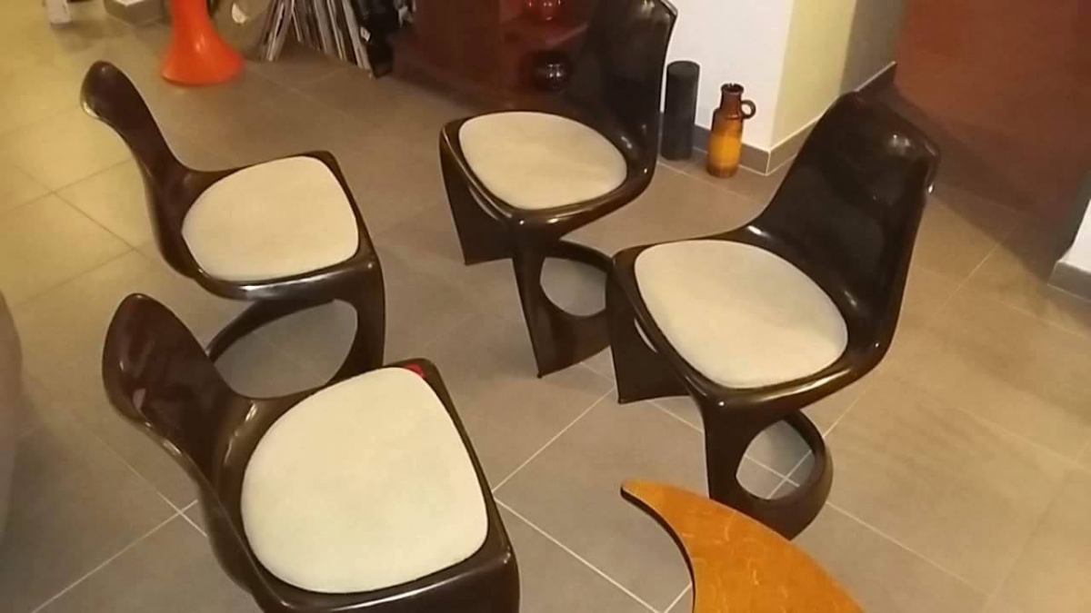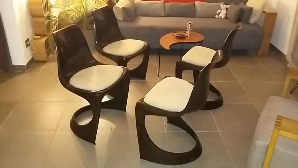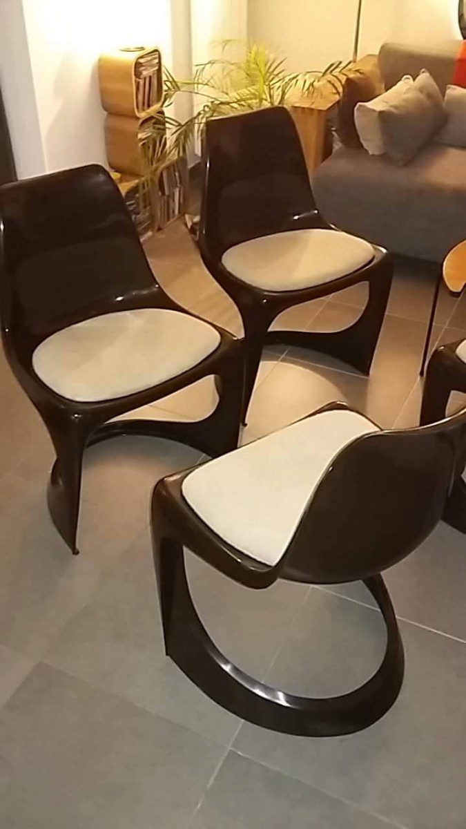Chaises design vintage à structure monobloc en plastique marron et assise beige, dans le plus pur design des années 70, éditées par Cado. Magnifique Lot en très belle état aussi bien plastique qu'assise. Steen OSTERGAARD :Steen Østergaard est né au Danemark 1935.