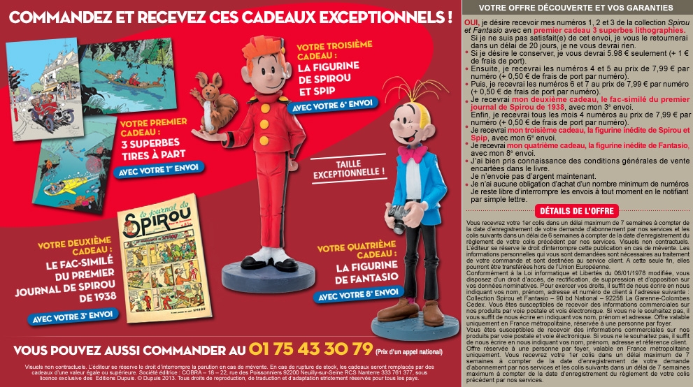 Collection de Spirou et Fantasio comportant 54 BDs et 2 figurines l'une de Spirou et Split de 17cm et l'autre de Fantasio de 19 cm. Comporte également le tout 1er journal de Spirou. Les 2 premières bd sont gratuites cars c'était le cas pour moi les figurines sont également gratuites.