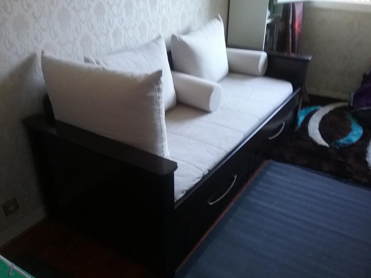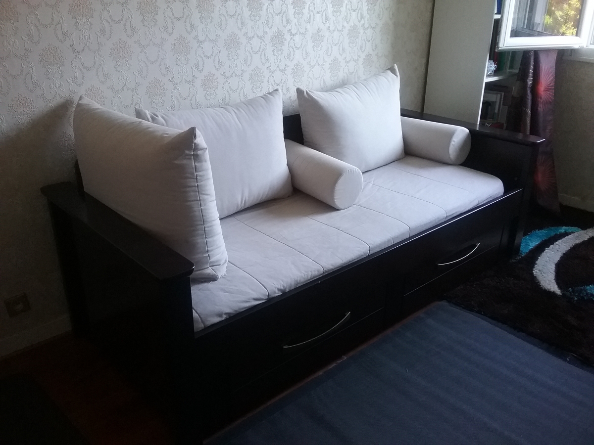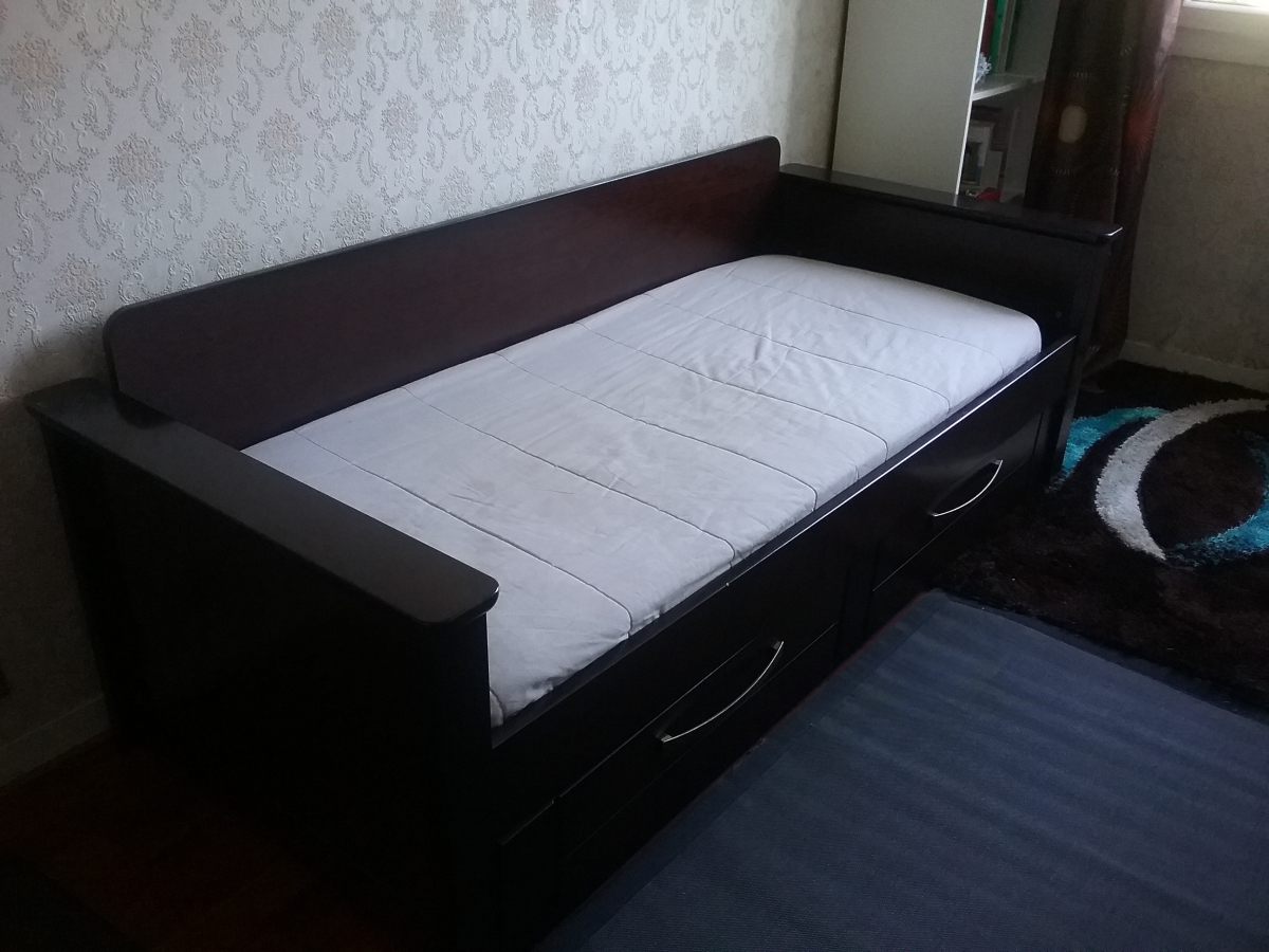Lit gigogne toscane en bois acajou de marque gauthier 80x200 avec dosseret coloniale et parure matelasse pour gigogne couleur ivoire + 1 matelas 80x190 . À venir chercher sur place à Beaumont sur oise