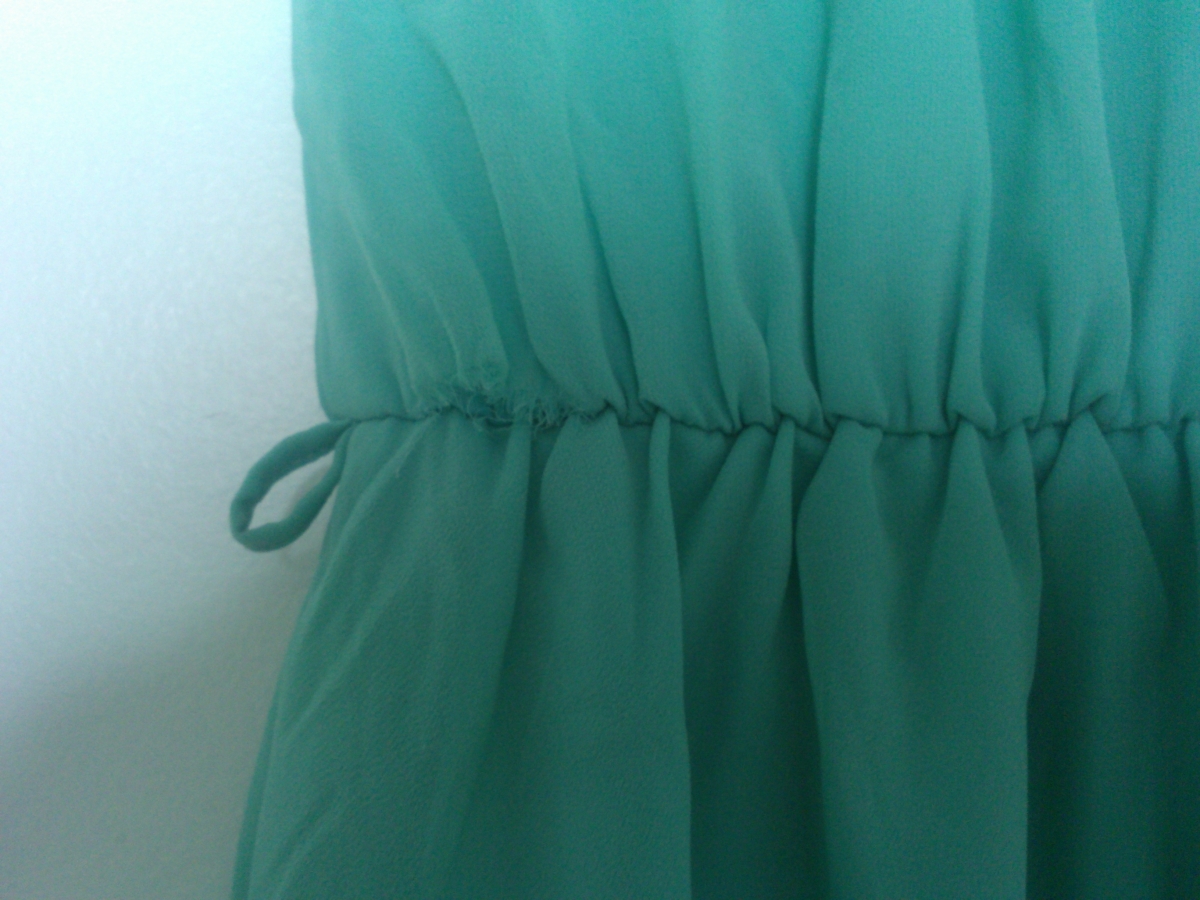 une petite déchirure au niveau de la taille (cf. photo), peut se cacher sous une ceinture ou à recoudre.