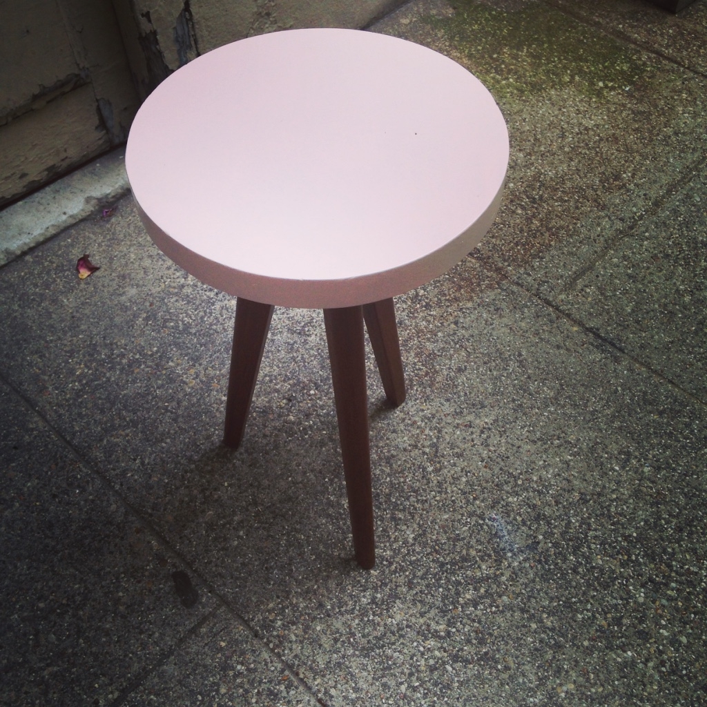 Mini table d'appoint tripode ancienne ou porte plante. Le dessus a été repeint en rose pale et les pieds compas ou fuseaux sont restés en bois naturel foncé. Look vintage / scandinave.
