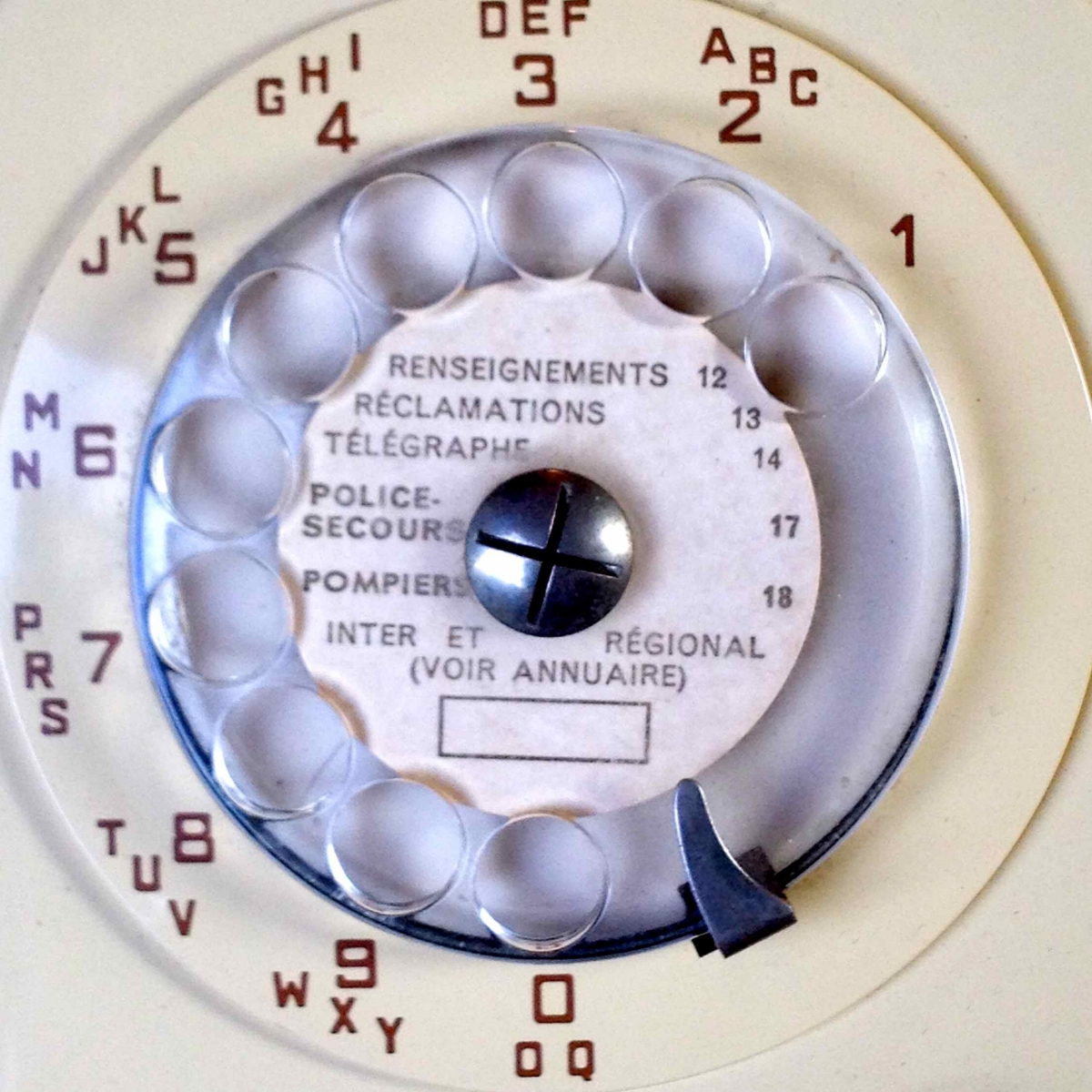 Ancien téléphone filaire électromécanique de table à cadran, écouteur et sonnerie S63 (conçu par la société d’économie mixte SOCOTEL en 1963).