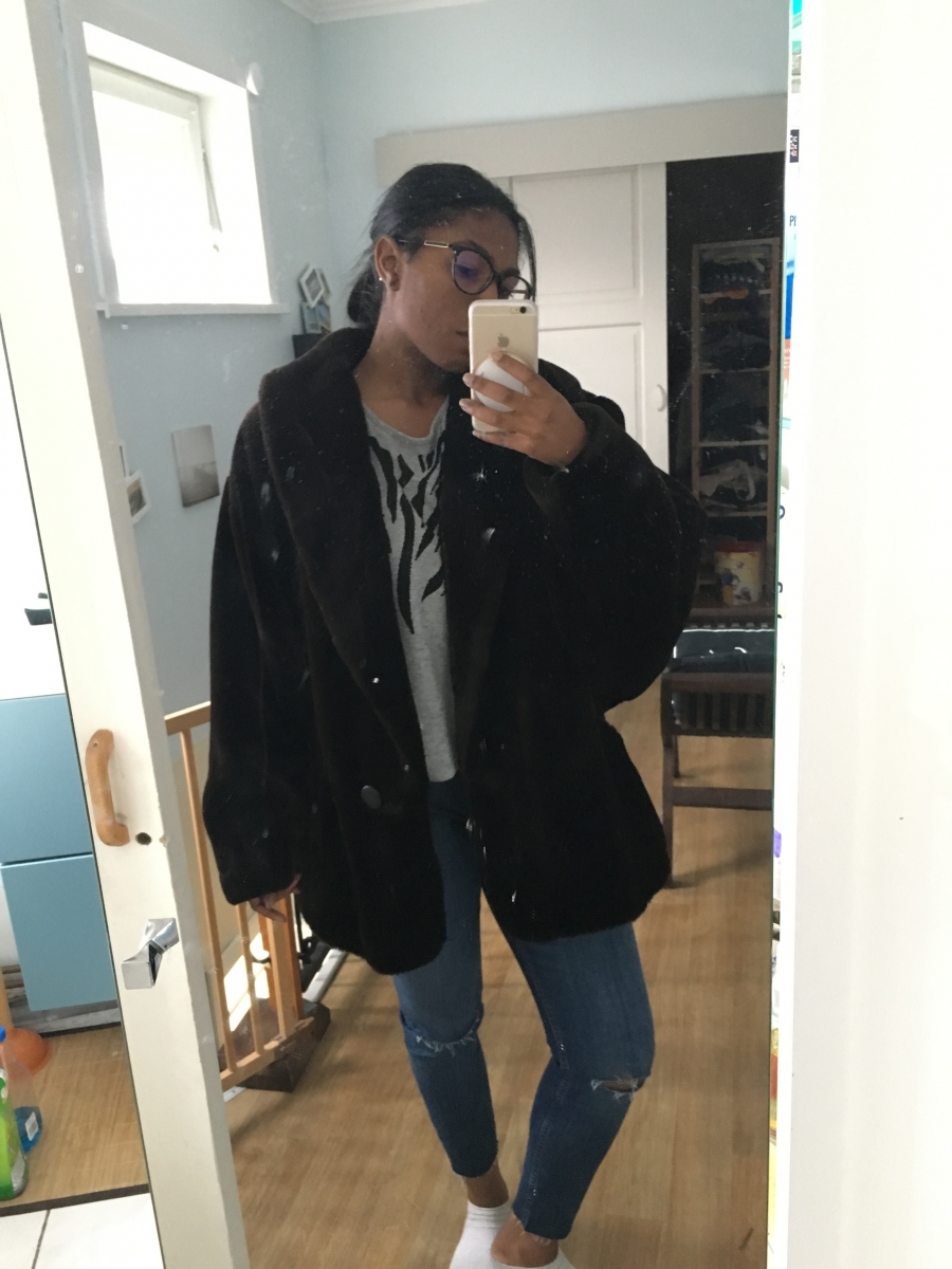 Alors d'habitude en manteau/veste je mets du M pour les coupes larges et L pour les coupes serrées/ cintrés. Ici le manteau est une taille 42 oversize, il est grand et très chaud je pourrais mettre l'équivalent de 2 pulls si tu veux une idée :)