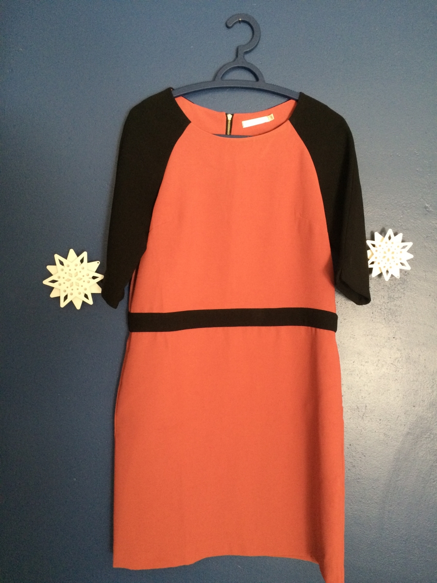 Robe en crèpe pèche rosée, cintrée taille haute, manche 3/4