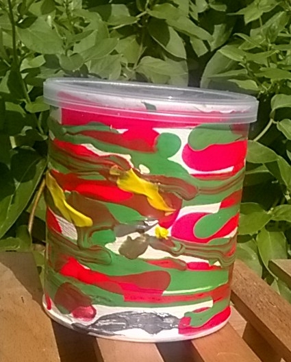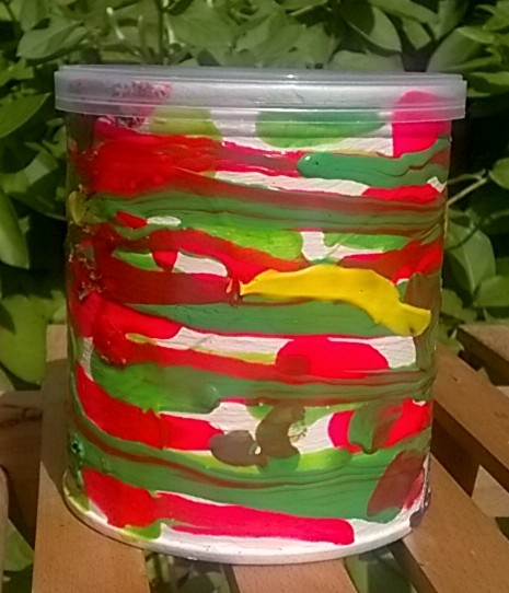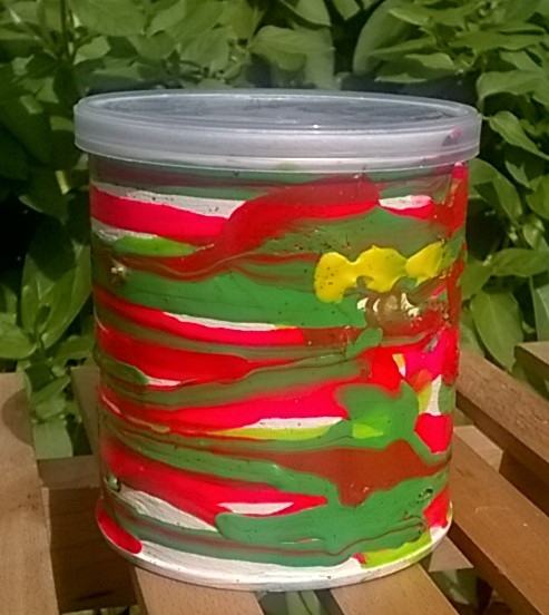 boite de chips recyclée (3 jours pour couche de fond, coulage peintures et séchage, vernissage). Hauteur : 8,5 cm, diamètre : 8 cm.