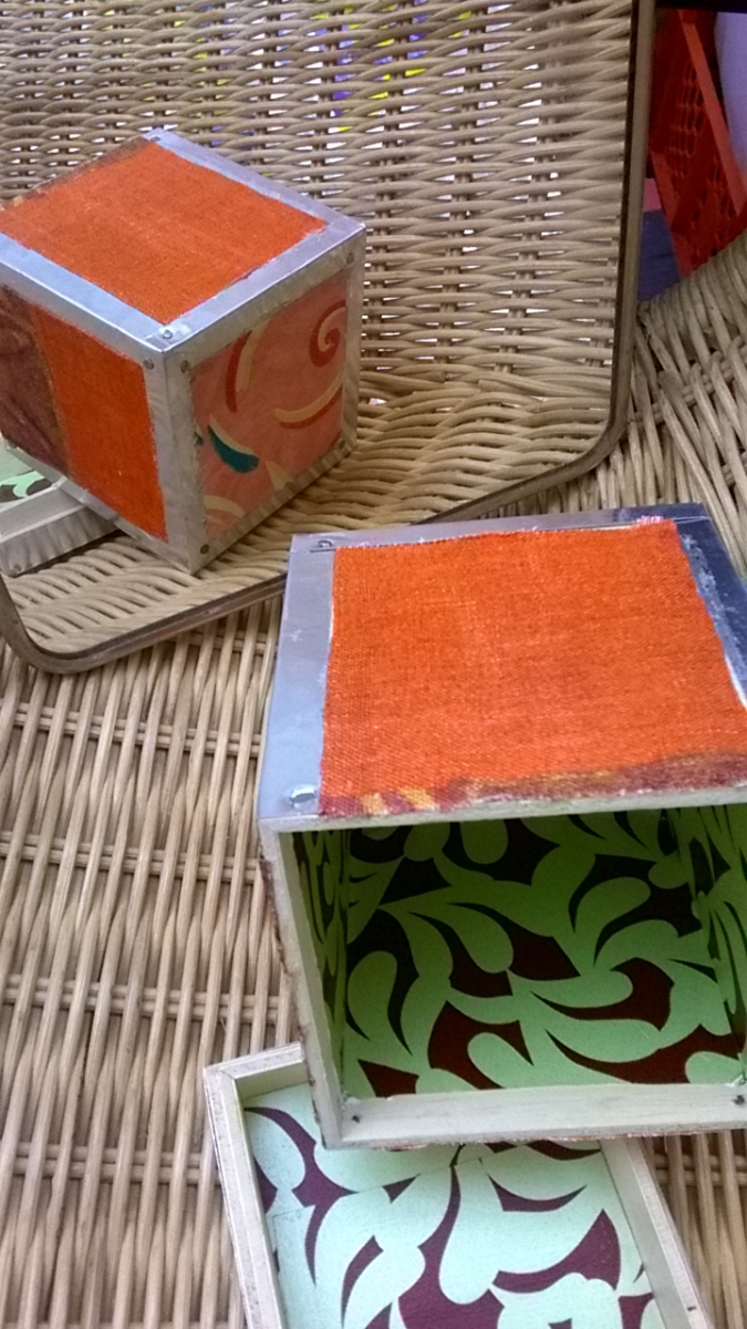 Pour vos petits secrets, vos bijoux..., des tissus vintage (60 et 70's) ont été savamment appliqués sur toutes les faces extérieures ; l'intérieur a été recouvert de papier peint (temps de fabrication : 1 jour et 1/2). Hauteur : 10 cm, côtés : 8,5 cm.
