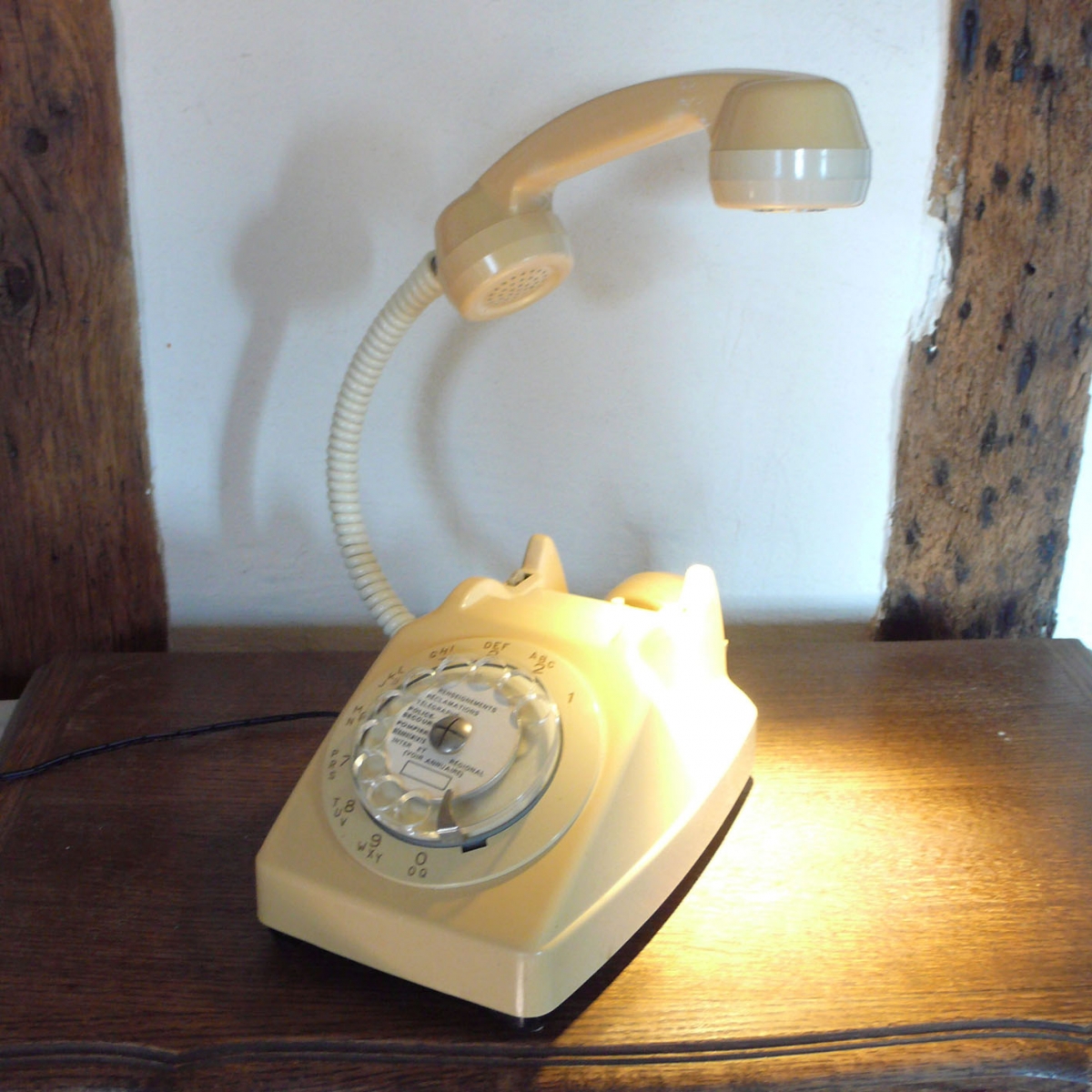 Téléphone vintage, modèle Socotel S63, transformé en lampe de bureau, couleur crème.