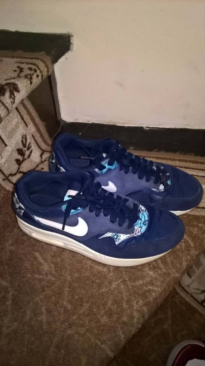 La paire est bleu avec le signe Nike en blanc , la semelle de la chaussure est jaune foncer . La paire à été porter que très peu de fois en extérieur elle est en bonne état , elle ce porte avec tout type de vêtements. Elle ce lave facilement avec de l'eau et de la lessive en main.