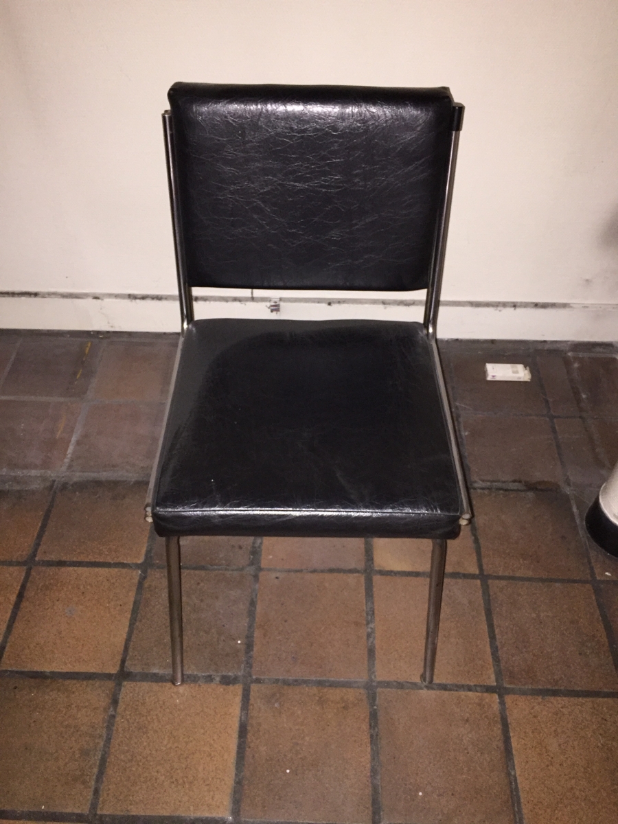 chaises de bureau type industriel, Skaï noir, pied inox légèrement oxydé.