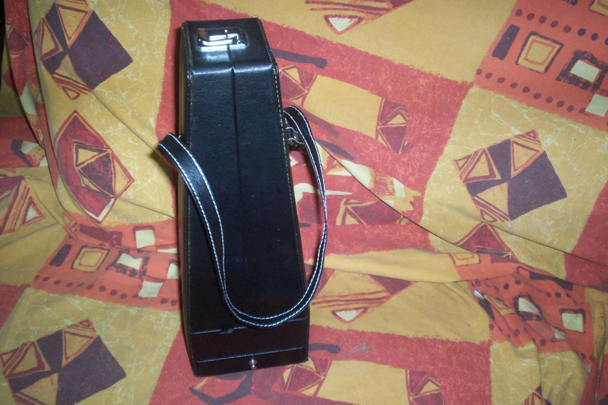 valisette de luxe en simili-cuir noir pour le transport d'une bouteille de champagne ou autre avec sangle pour transport a la main objet d'occasion en très bon état avec dessous tiroir pour tire-bouchon .