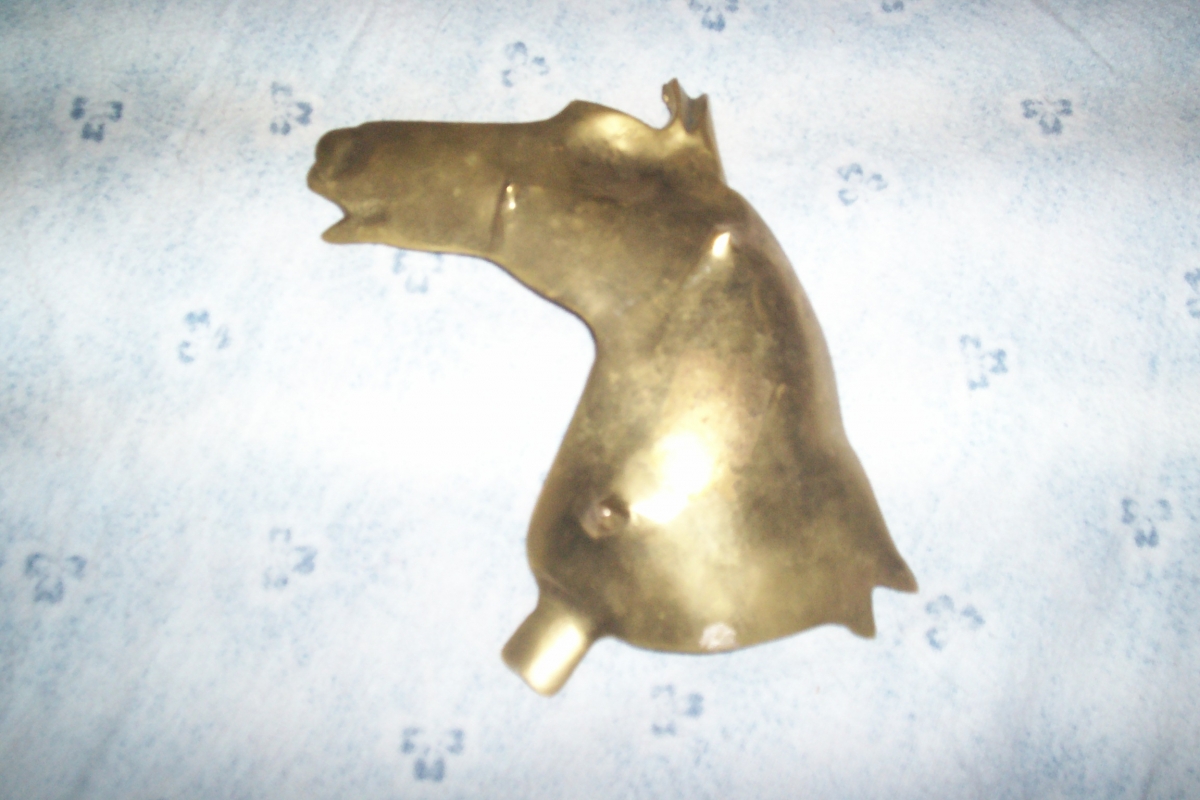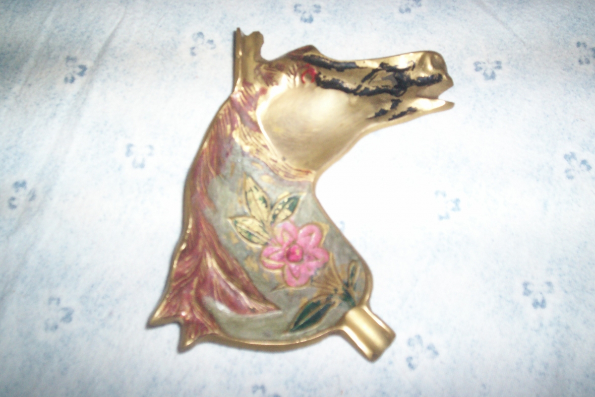 cendrier de table tête de cheval en laiton fleurs relief objet d'occasion en très bon état .