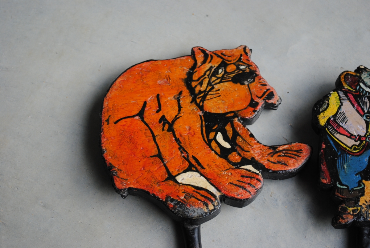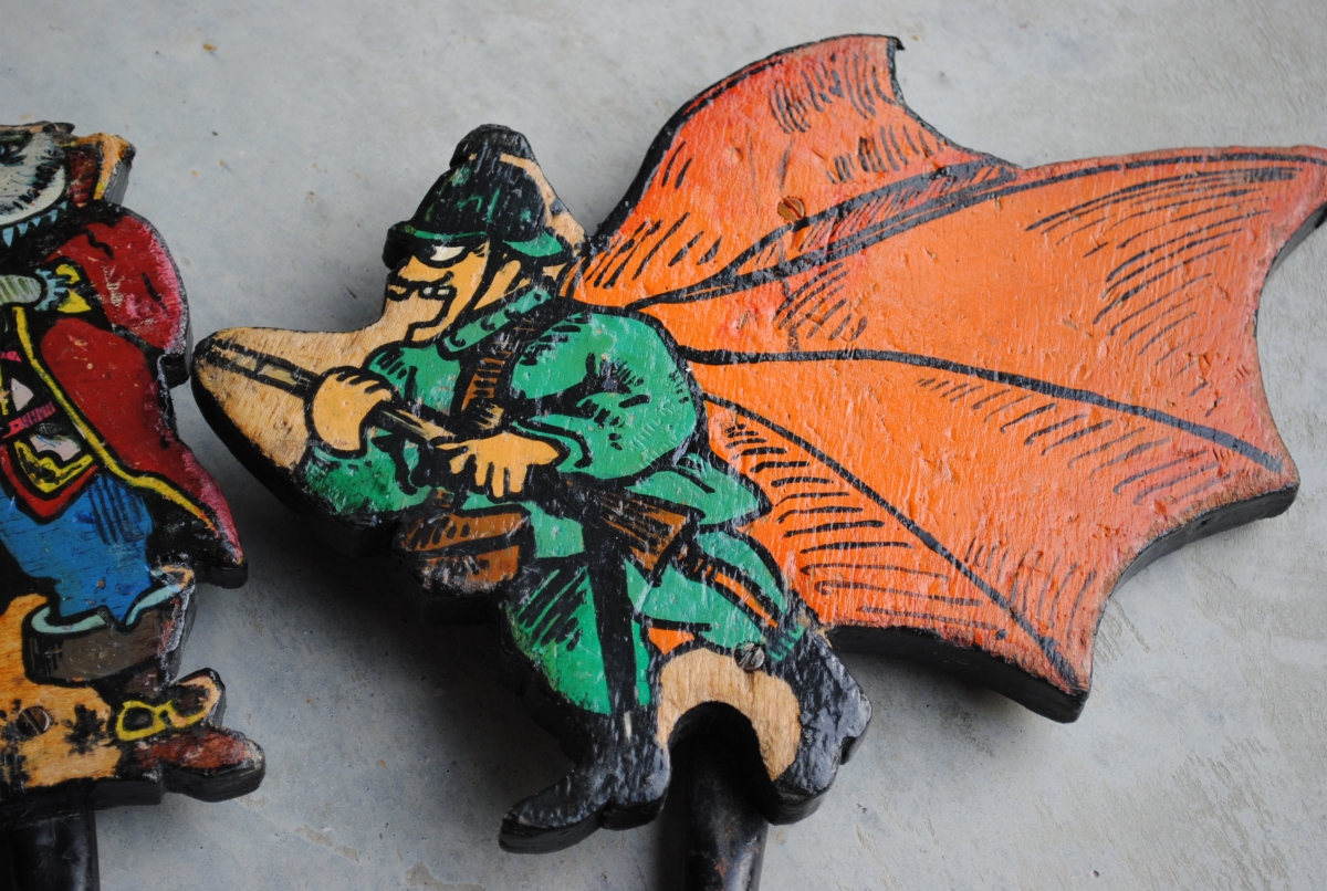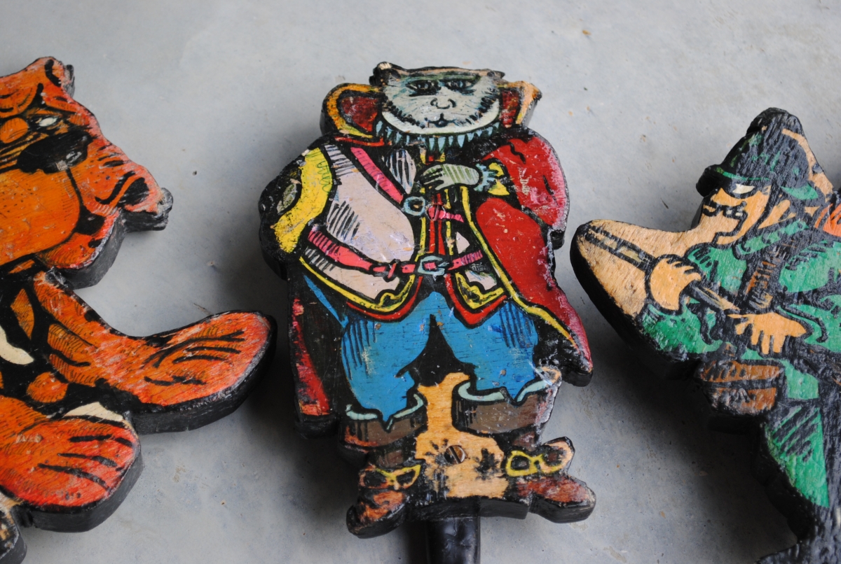 3 Marionnettes de théâtres en peinte et vernis , tige en métal . Dimensions : Hauteur 49 cm , largeur 25 cm pour la plus grande.