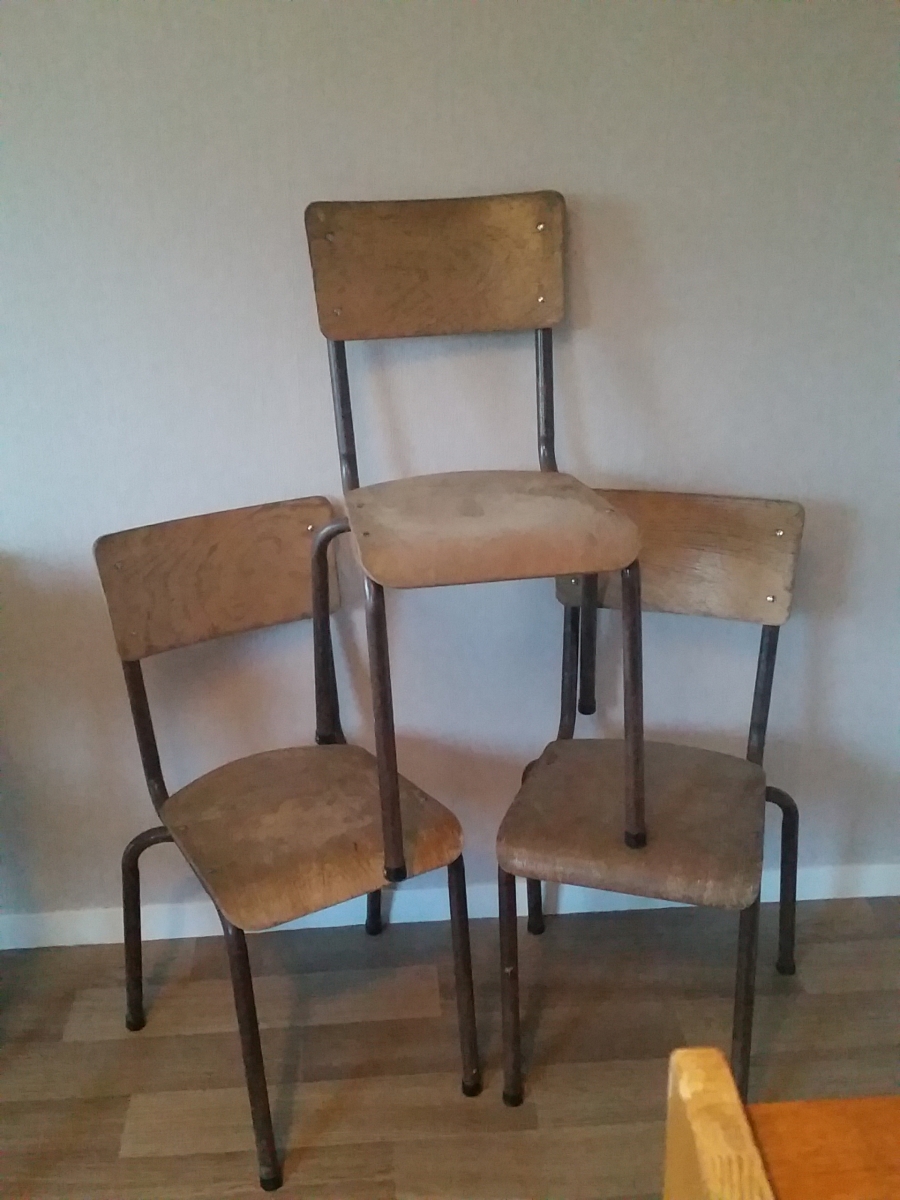 3 chaises d'écolier en bois et fer (pieds rouillés) dans leur jus. 15 euros l'une