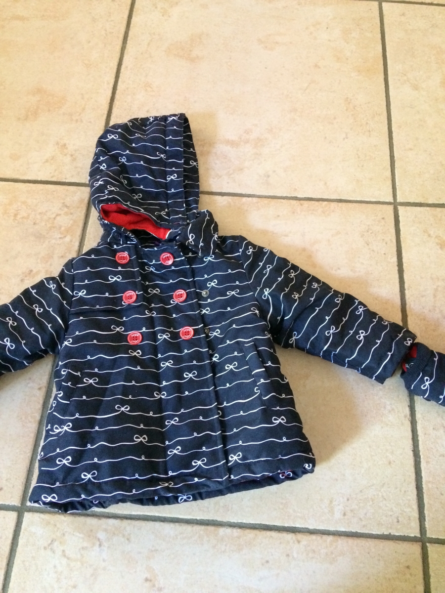 Manteau bleu et rouge très bon état avec capuche et moufles amovibles .