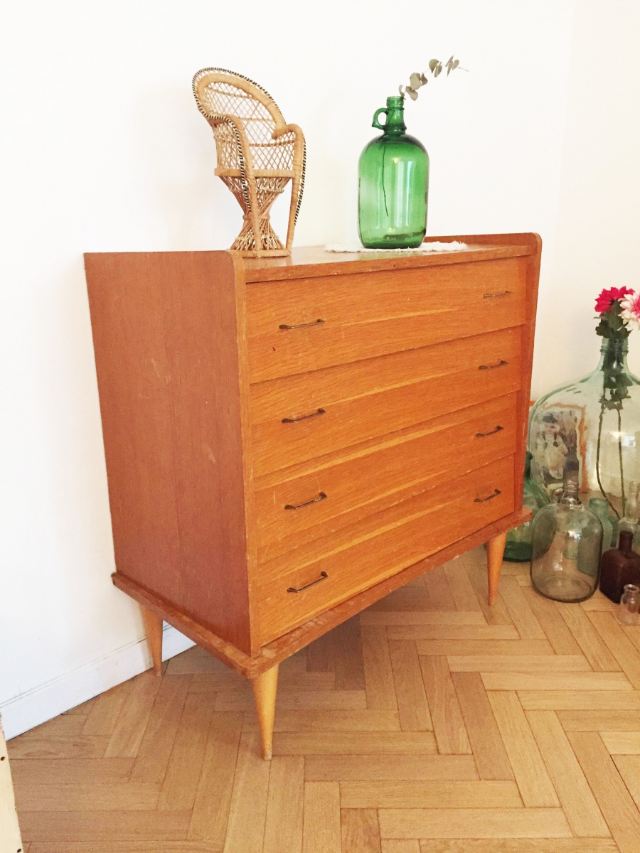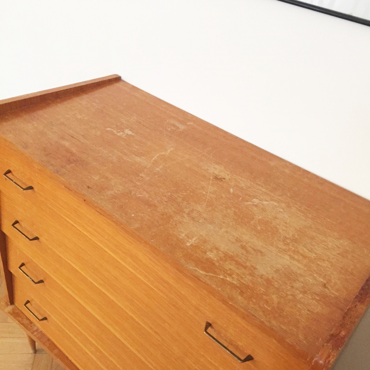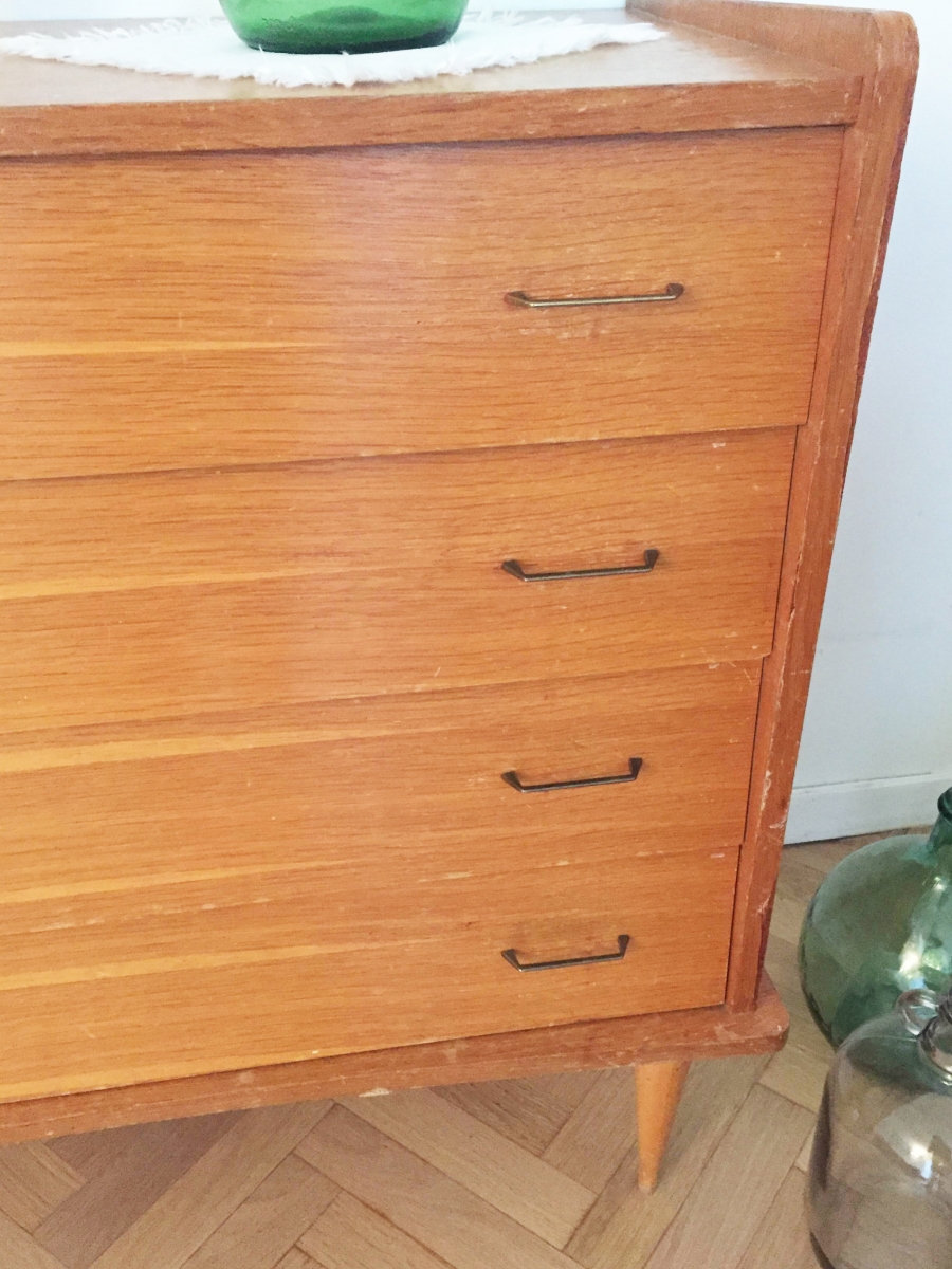 Commode vintage années 70 avec pieds compas, idéal pour une restauration, ou pour ceux qui aiment les meubles dans leur jus.