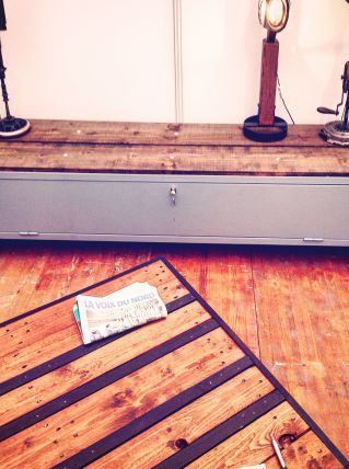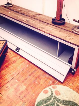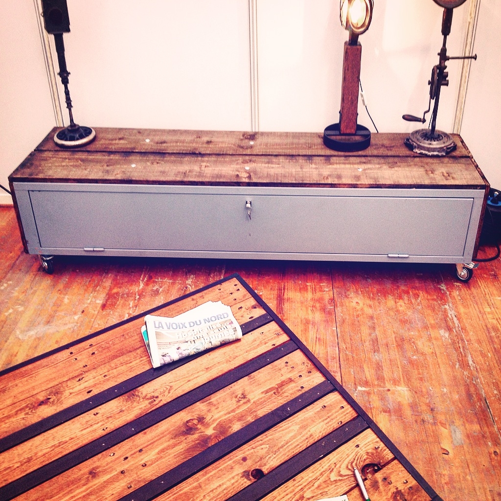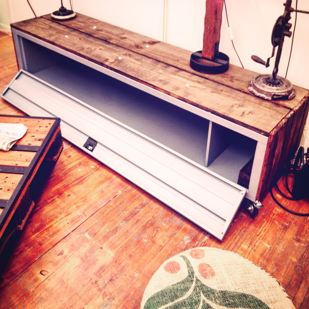 Meuble TV industriel, plateau en pin lasuré et vernis, 4 roulettes pivotantes. Longueur 2 mètres