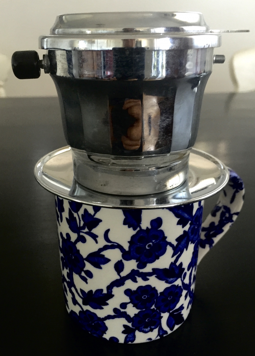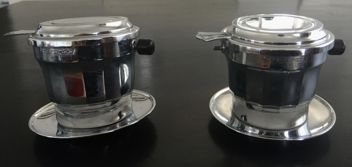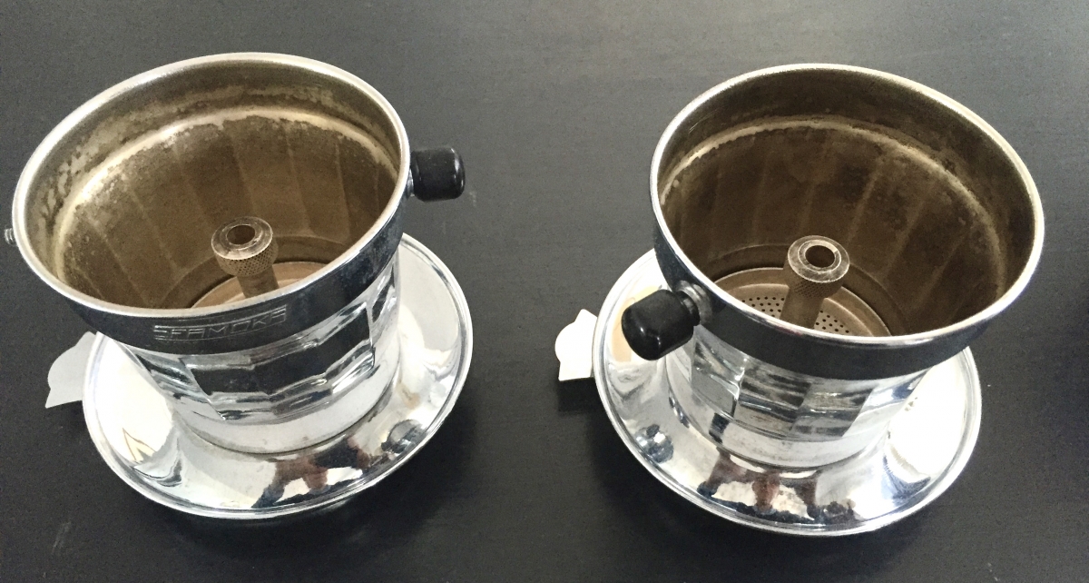 Filtre à café de la marque française SFAMOKA en chrome sur laiton et bouton bakélite.