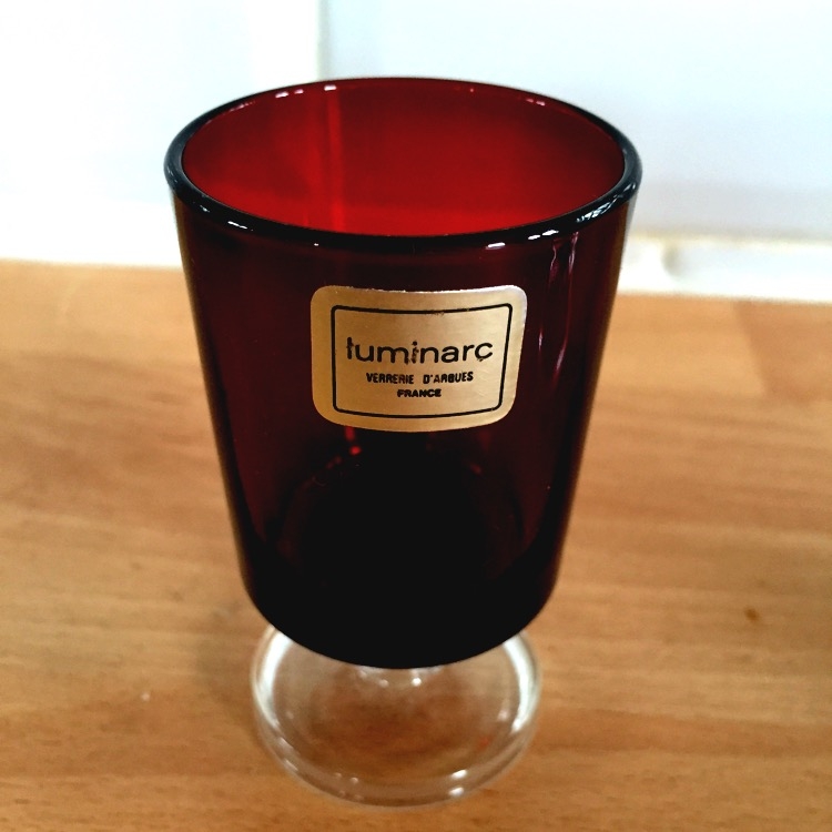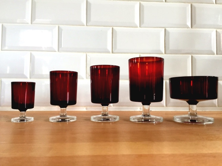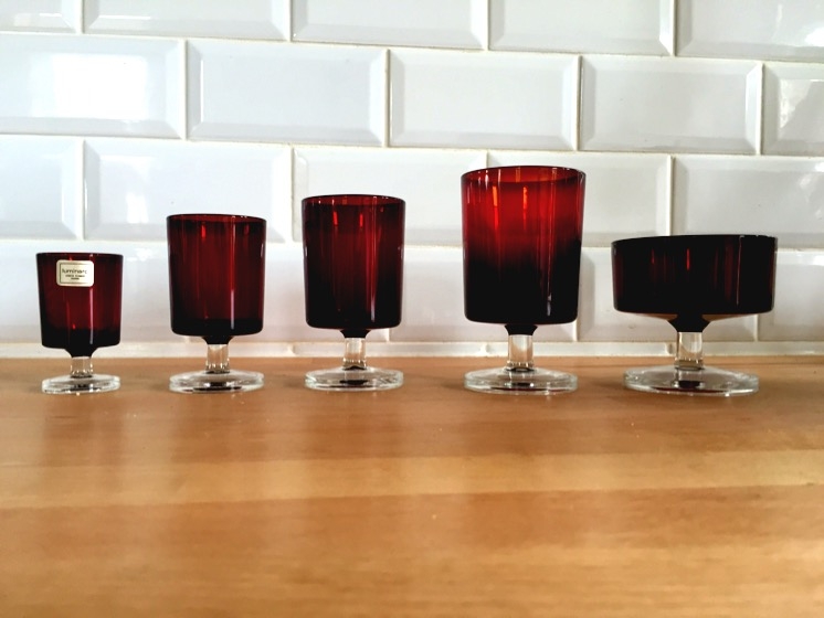 Rare, série complète de verres rouge rubis Luminarc modèle Suède au design scandinave vintage de différentes tailles, fabriqués en France dans les années 70.