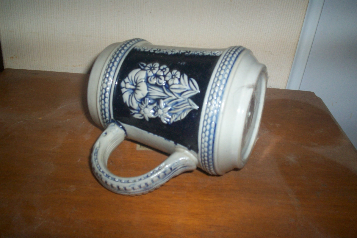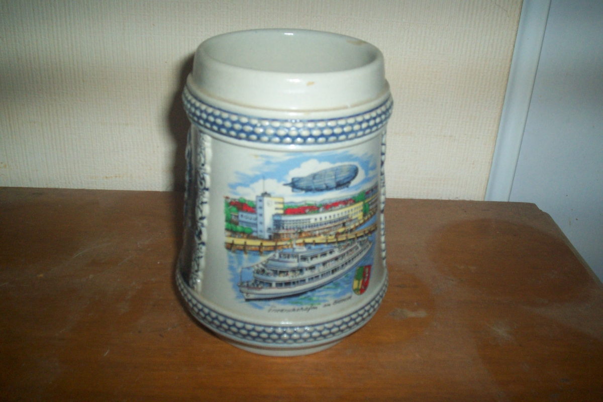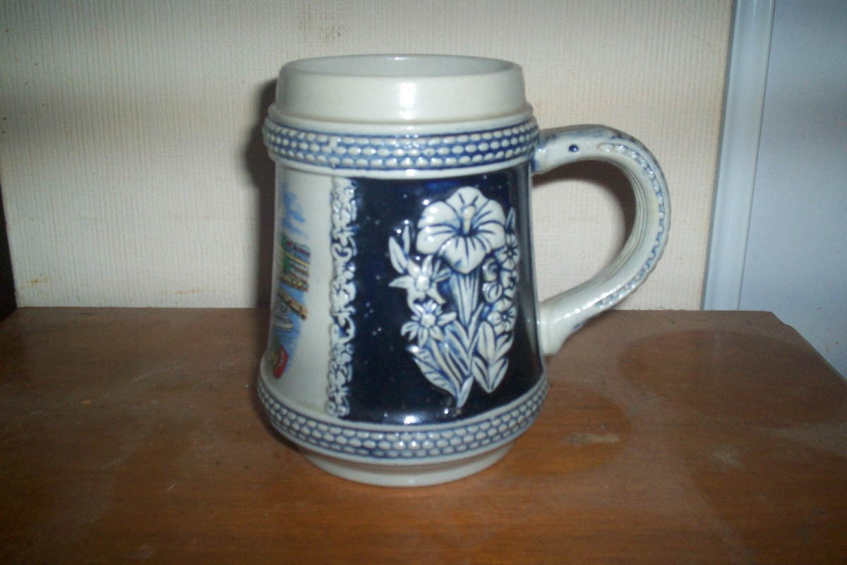 chope à bière en céramique décor relief fleurs et paysage bateau et mongolfière chope 14 cm de haute et en très bon état .