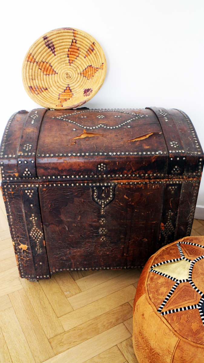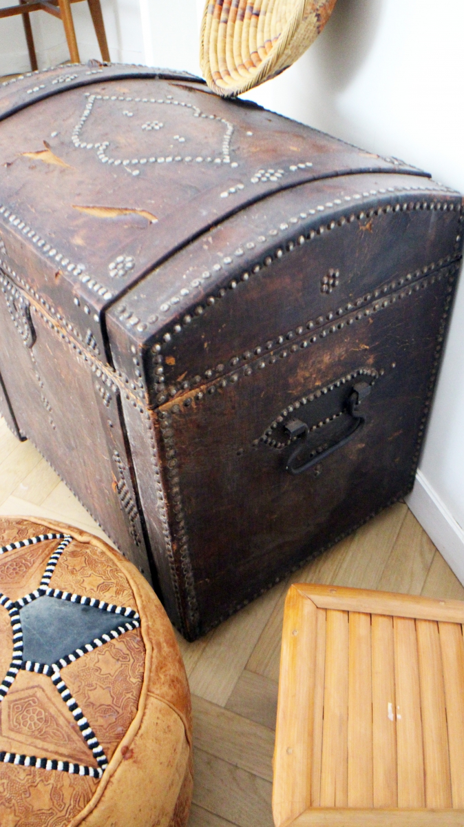 Magnifique malle vintage revêtue de cuir marron dans son jus ornée de clous.