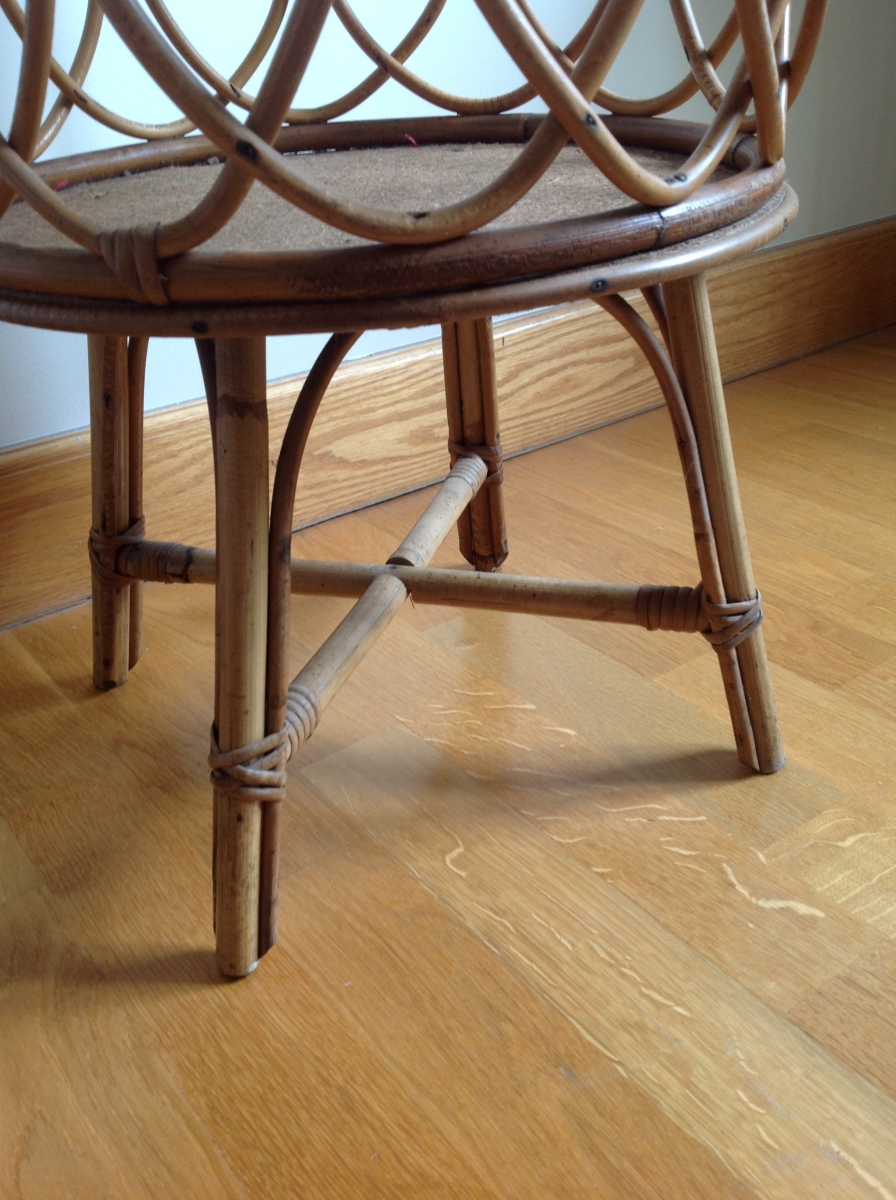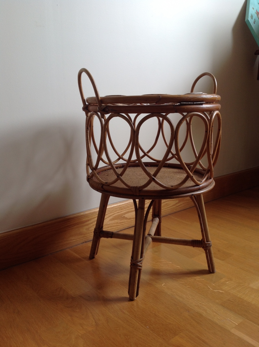 Une magnifique travailleuse en rotin Qui ravira votre intérieur . parfait pour tout les bazars de la vie quotidienne tels que les doudounes et autres jouets . Dans son jus , les petites tâches noires représente les clous mais bon état d'ensemble. J'ai enlevé le tissu c'est une volonté de ma part pour un effet plus moderne. Hauteur totale 52 cm, diamètre 39 cm, hauteur du panier 25 cm