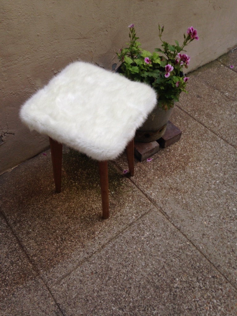 Ancien tabouret rétro vintage des années 60 rénové avec de la moumoute blanche / fausse-fourrure.