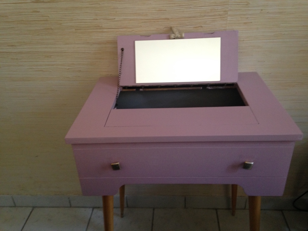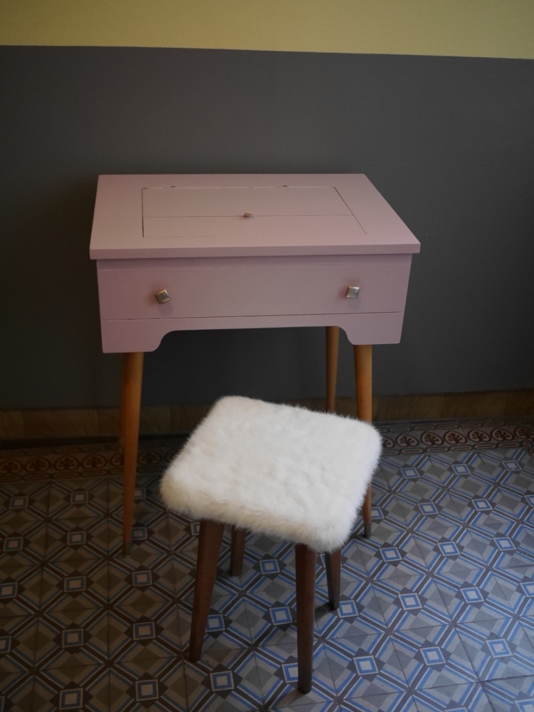 Cette jolie table était à l'origine un meuble de machine à coudre. Un peu de ruse, et voici une belle coiffeuse pour ranger maquillage et bazar féminin. Elle s'ouvre par le haut. (avec un crochet placé au dos permet de lever l'ouverture, ou en tirant sur le petit noeud au dessus du miroir). Avec ses pieds compas ou fuselés en bois clair avec détails en métal sur ceux de devant, elle garde un look très vintage et scandinave. L'intérieur est tapissé de papier peint à paillettes.