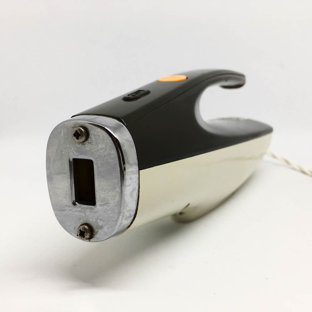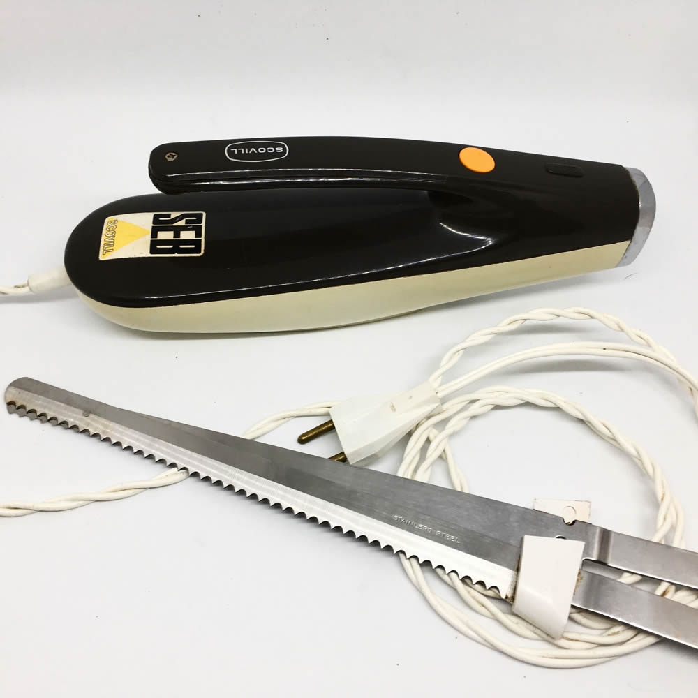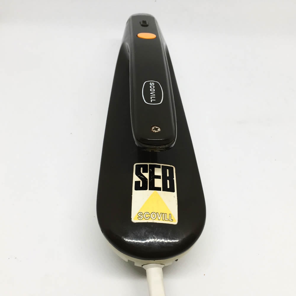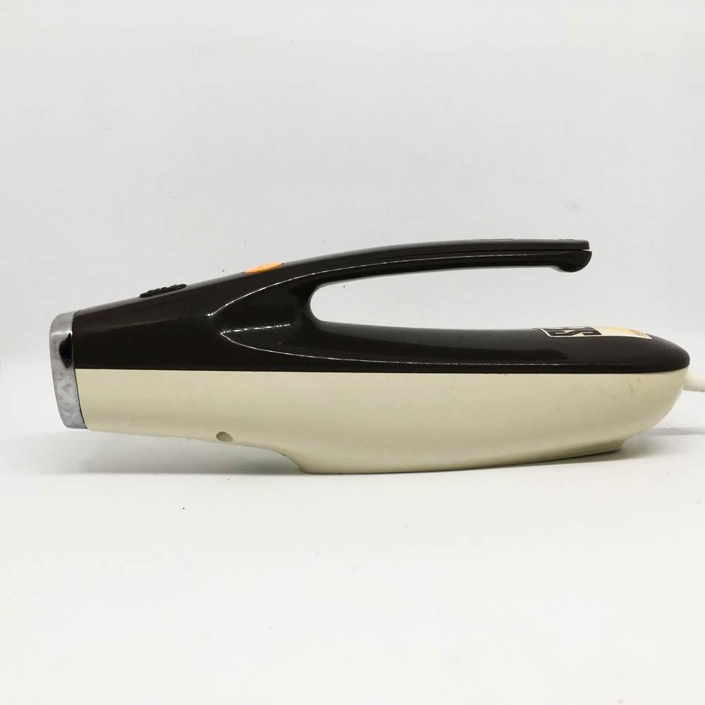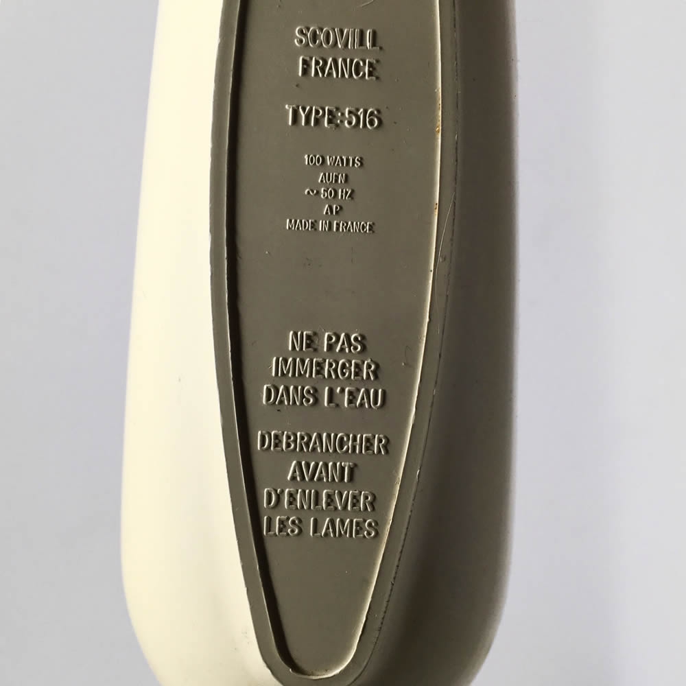 L'entreprise SEB à racheté l'usine française du fabricant américain Scoville en 1969, la double étiquette de ce modèle 516 permet donc de le dater juste après le rachat. Un classique en marron, crème et bouton orange - accessoirement, il fonctionne encore.