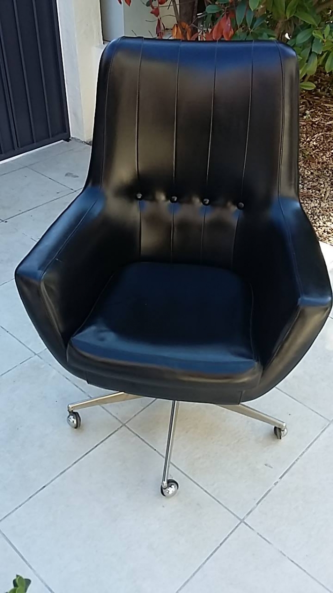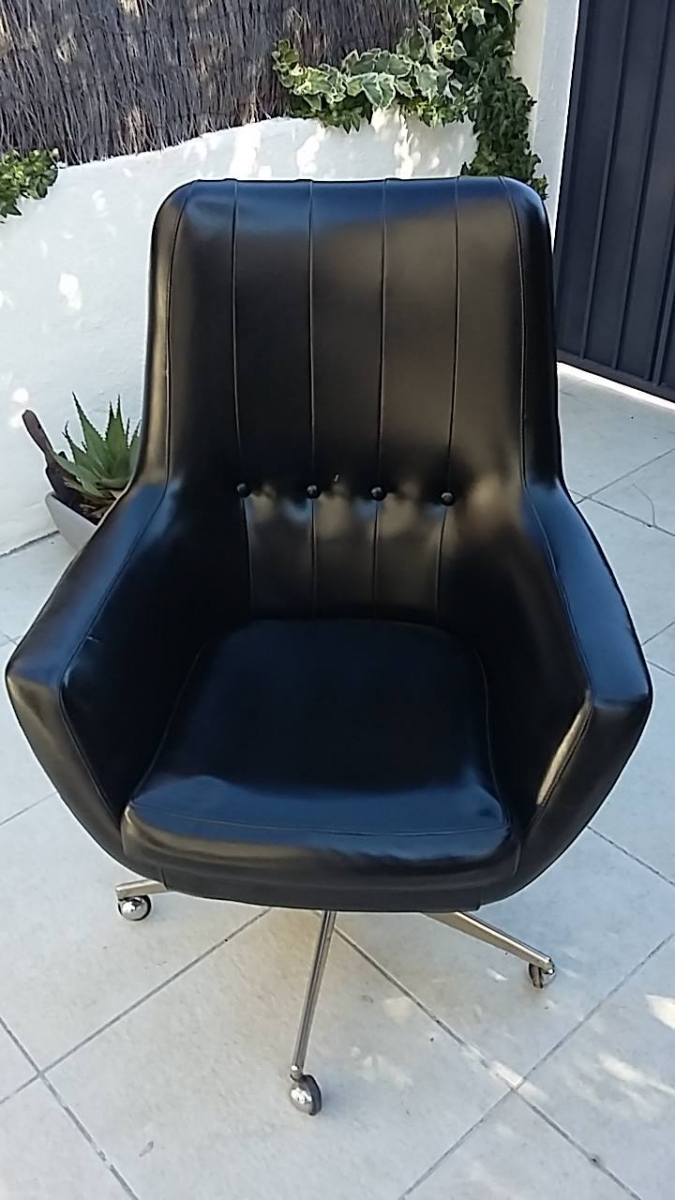 Superbe fauteuil pure vintage 50/60 en skaï de haute qualité (voir photos) de couleur noir. Cette qualité de skaï a permis à ce fauteuil de passer les décennies sans prendre une ride, intemporel et d'un grand confort il saura s'accoupler à votre décor sans effort ! on en fait plus des comme ça...