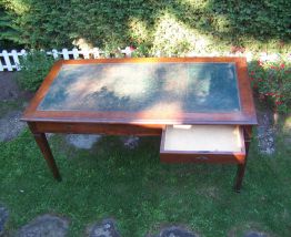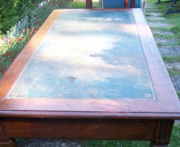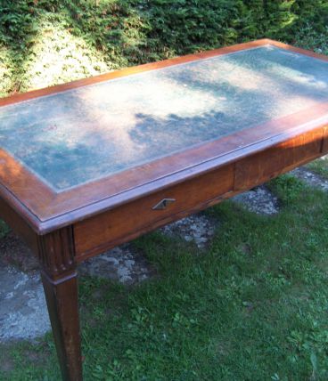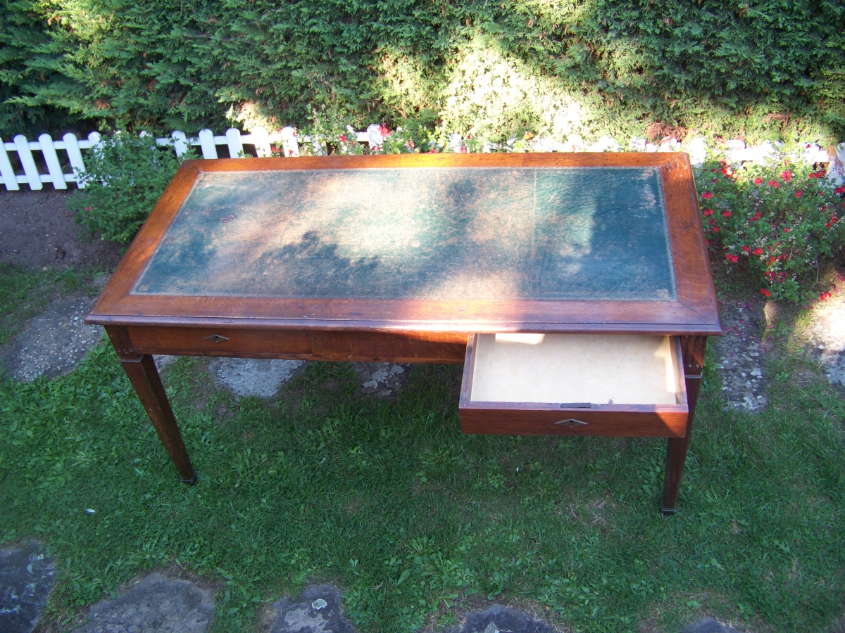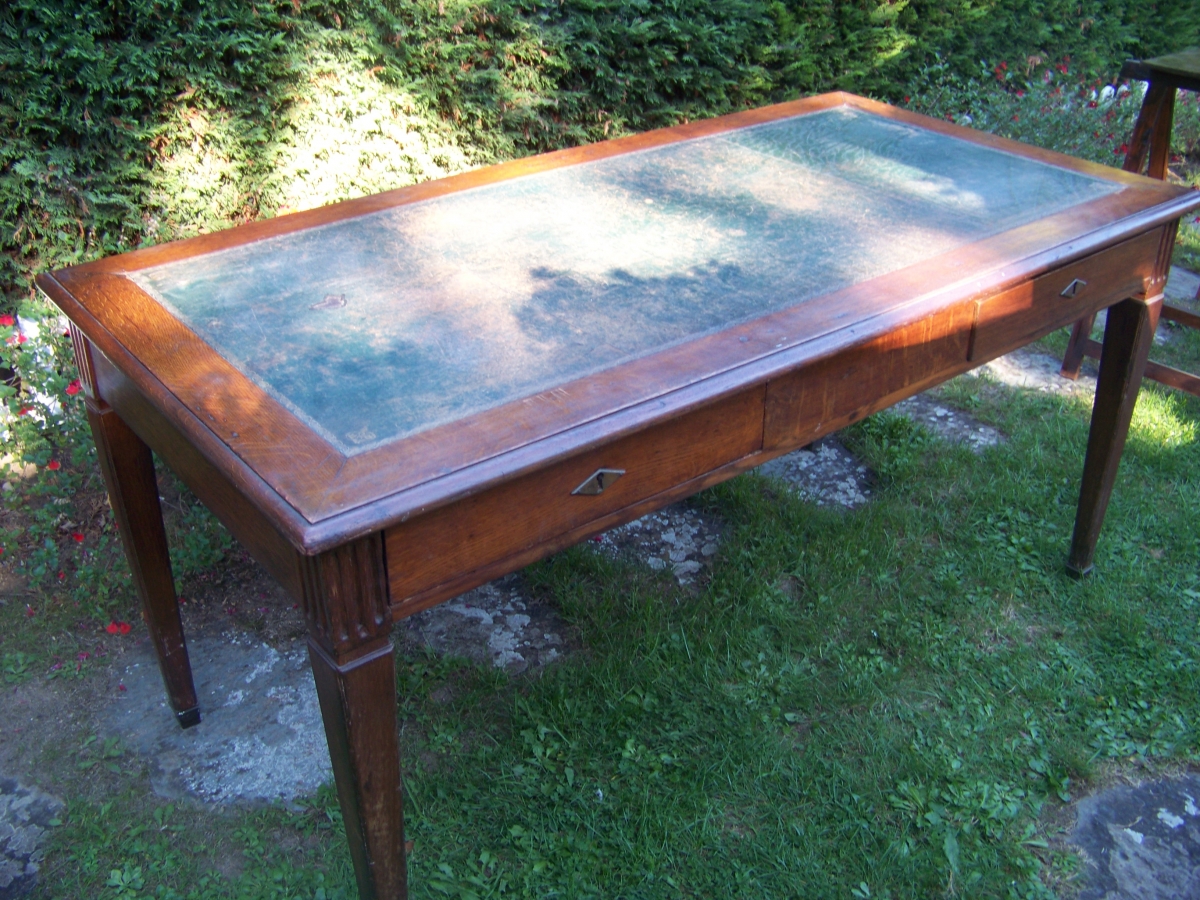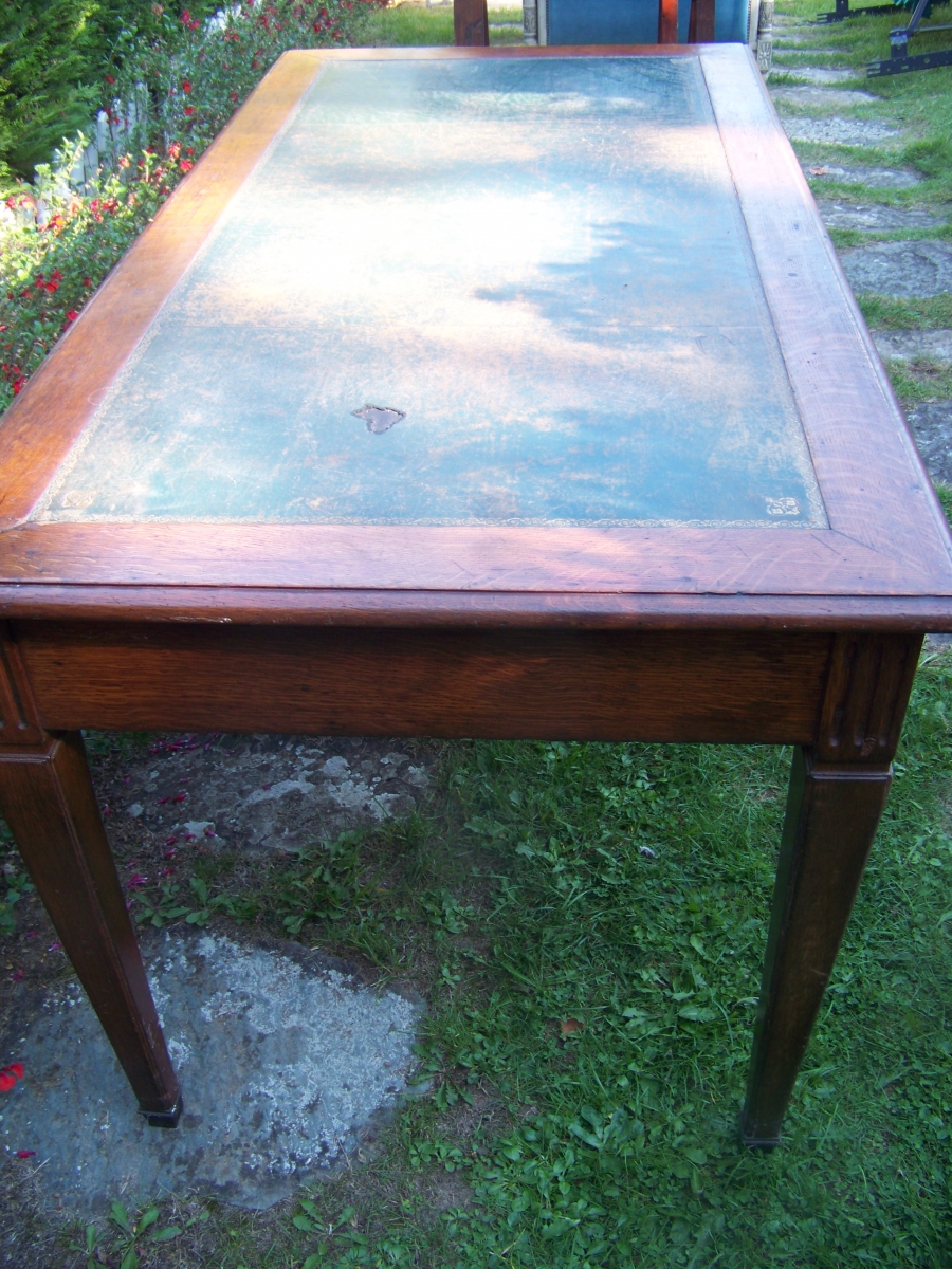 GRAND BUREAU DIRECTOIRE - CHÊNE MASSIF ANCIEN - DESSUS CUIR VERT - VITRE DE PROTECTION SPÉCIALE POUR PROTECTION - 2 GRANDS TIROIRS AVEC SERRURES.