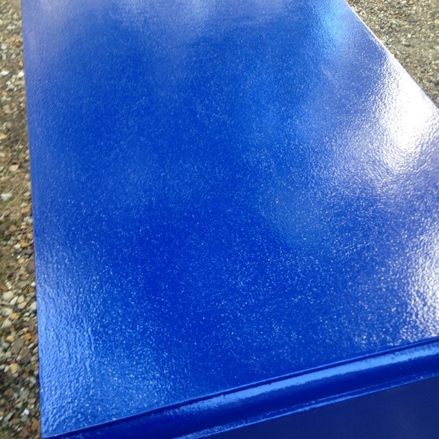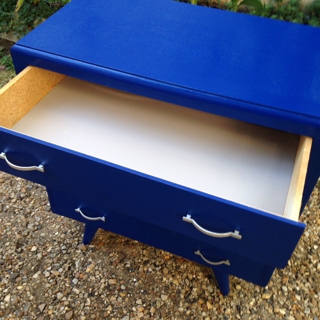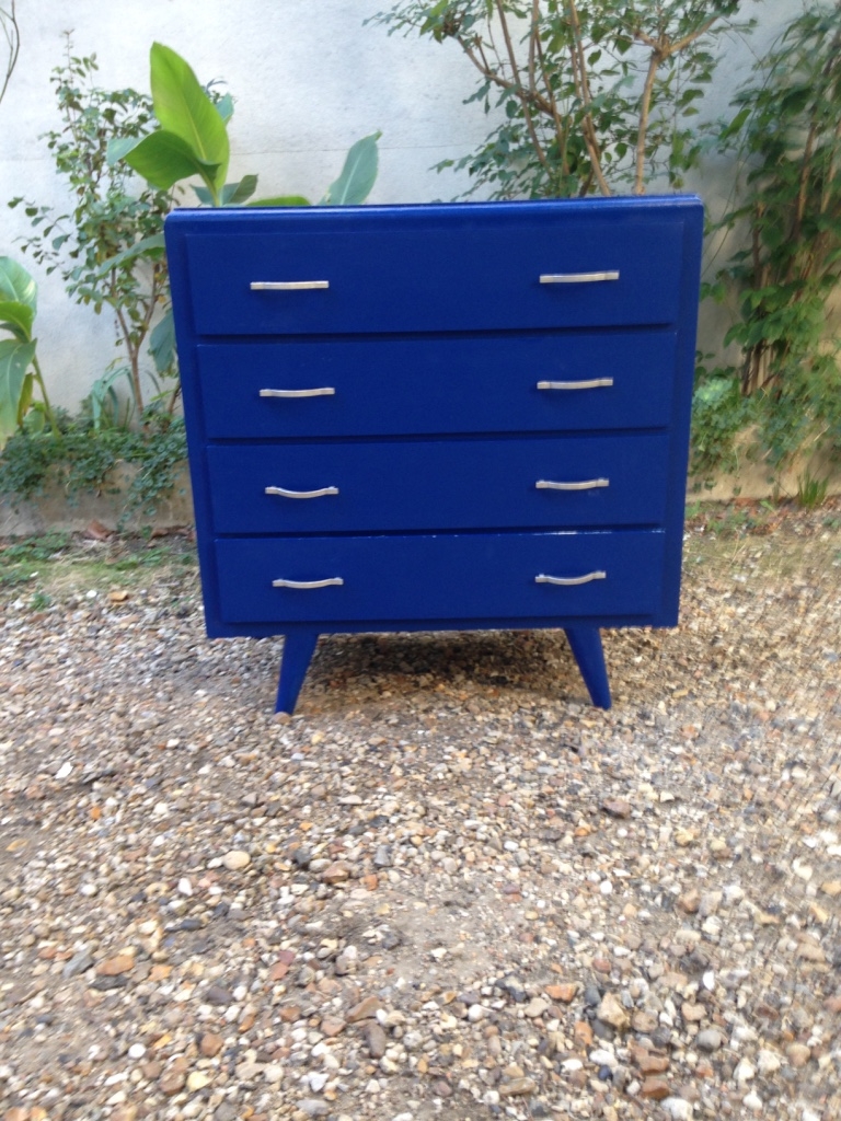 Commode pieds compas vintage des années 50-70 rénovée et repeinte en bleu et bleu à paillettes sur le dessus.