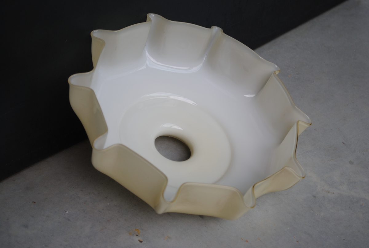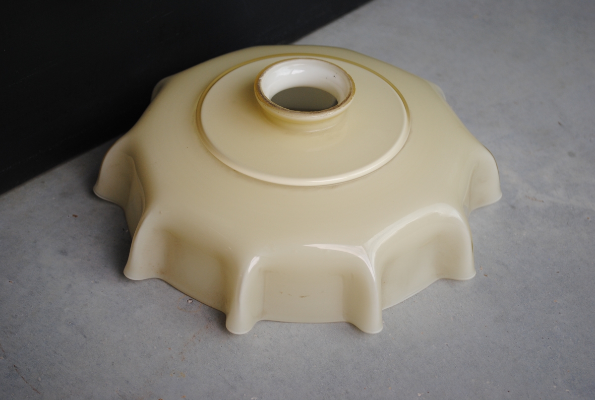 Abat jour pour suspension en verre couleur crème . Diamètre 24.5cm hauteur 8.5 cm . Trou pour l'équiper électriquement 4 cm.