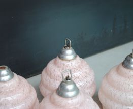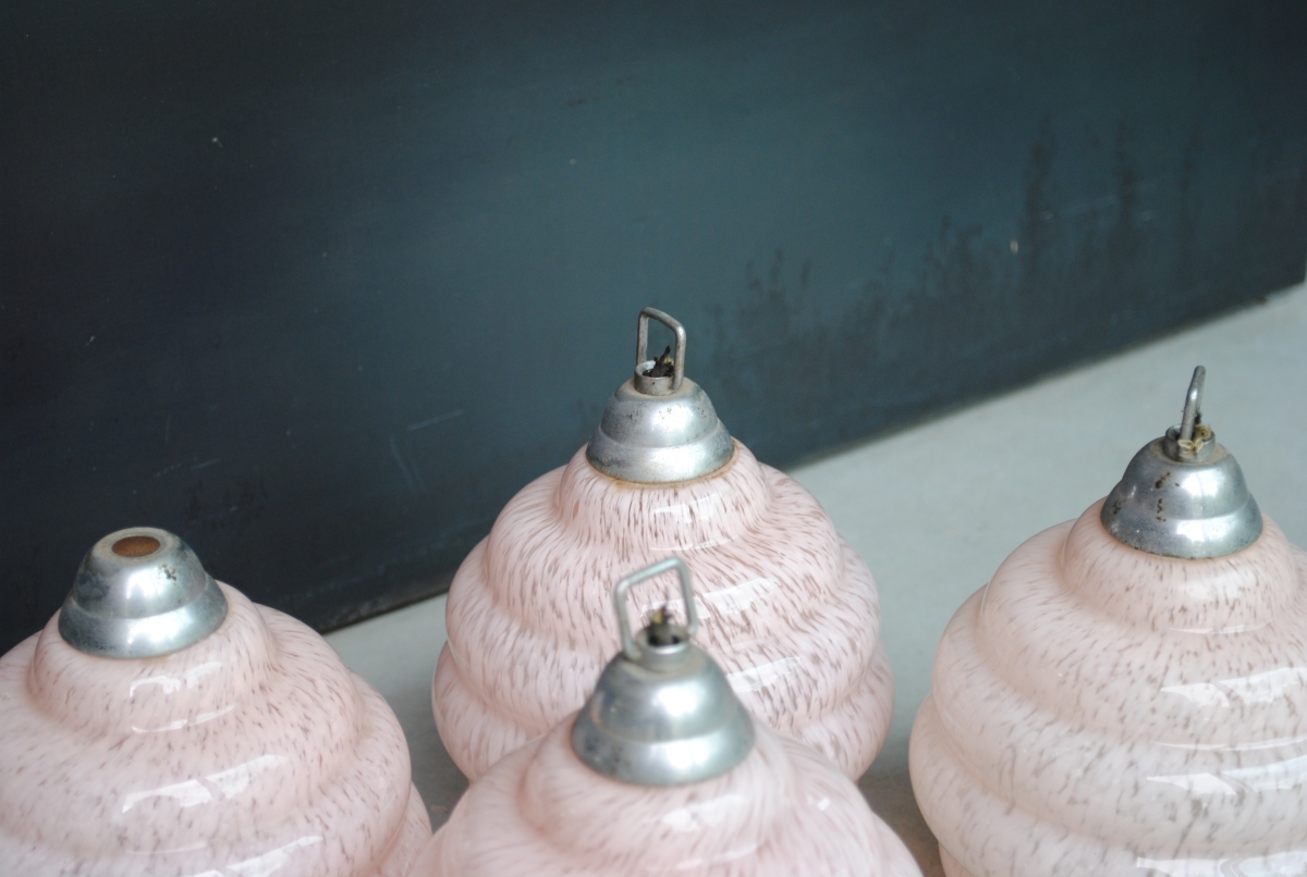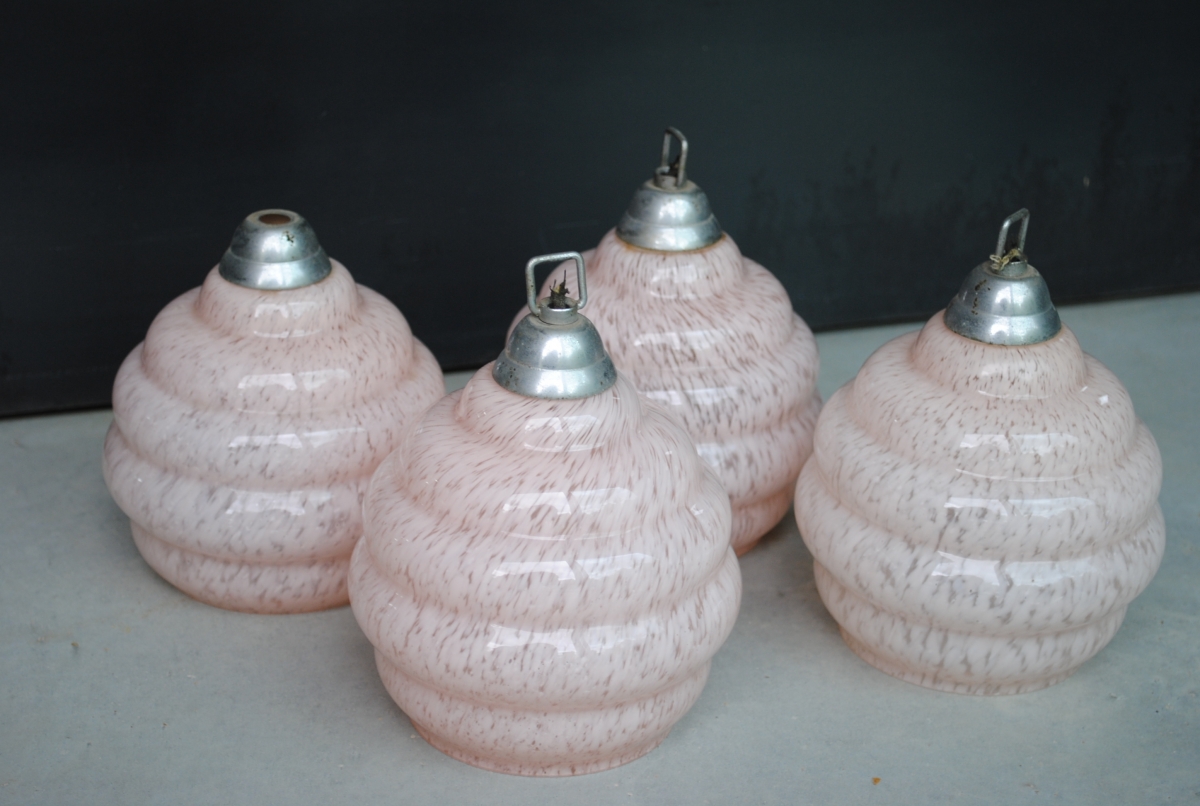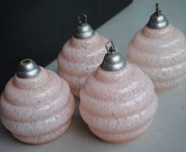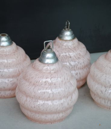 4 Globes boule rose moucheté dans leur jus équipé de leur douille laiton d'origine ( sauf sur une) . Vendu en lot de 4 .Diamètre 13 cm , hauteur 14 cm