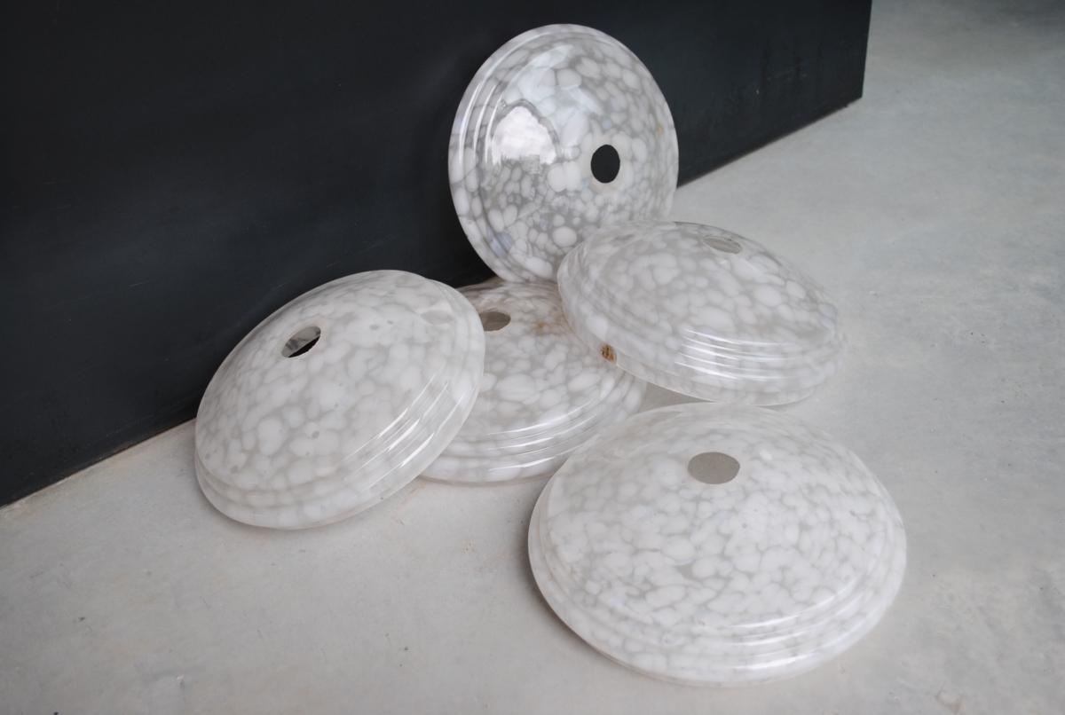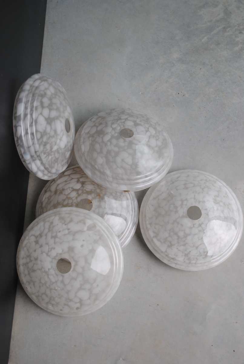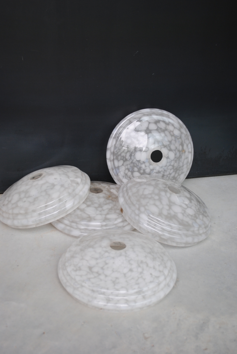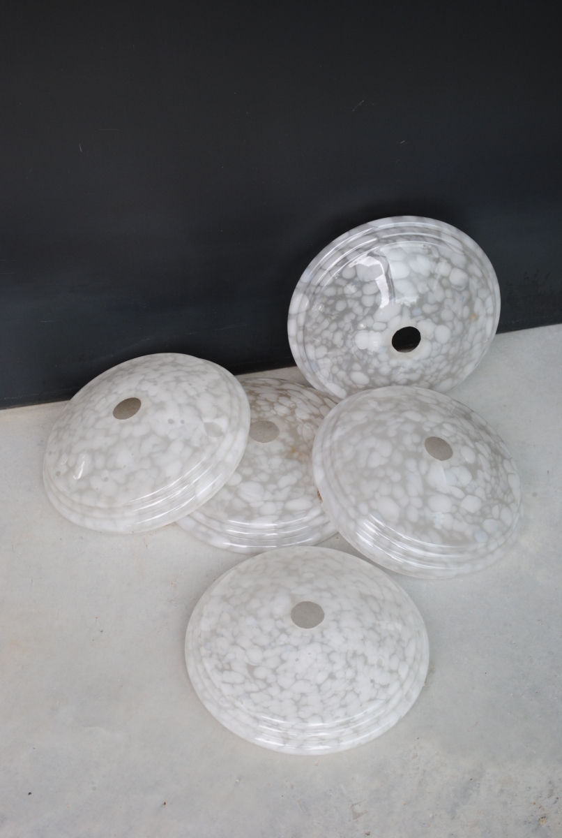 Abat jour en verre moucheté blanc type verre de Clichy . Dans leur jus .Diamètre 21.5 cm , hauteur 7 cm et trou pour la douille 2.7 cm (pouvant être équipé électriquement facilement avec les kits pour suspensions dans les magasins de bricolage ) .5 pièces disponible vendu a l'unité .