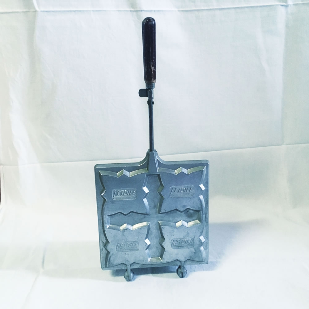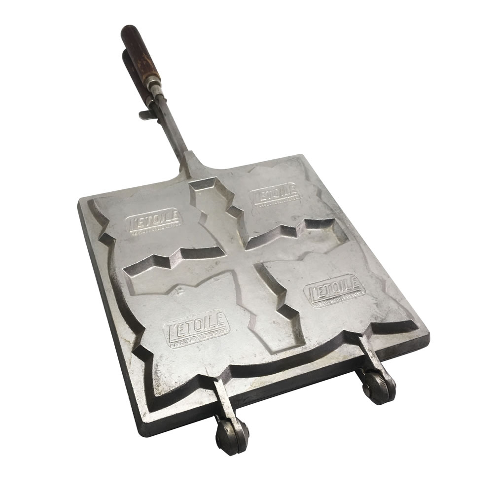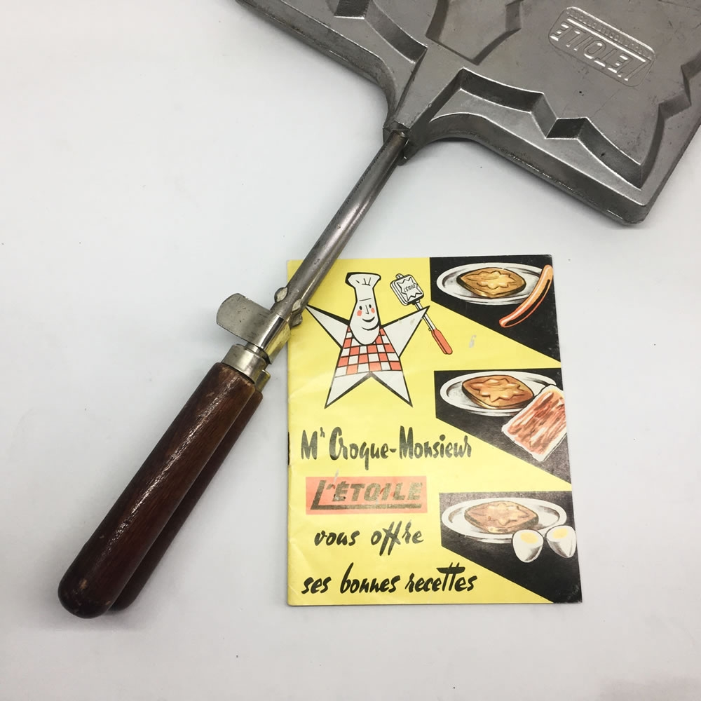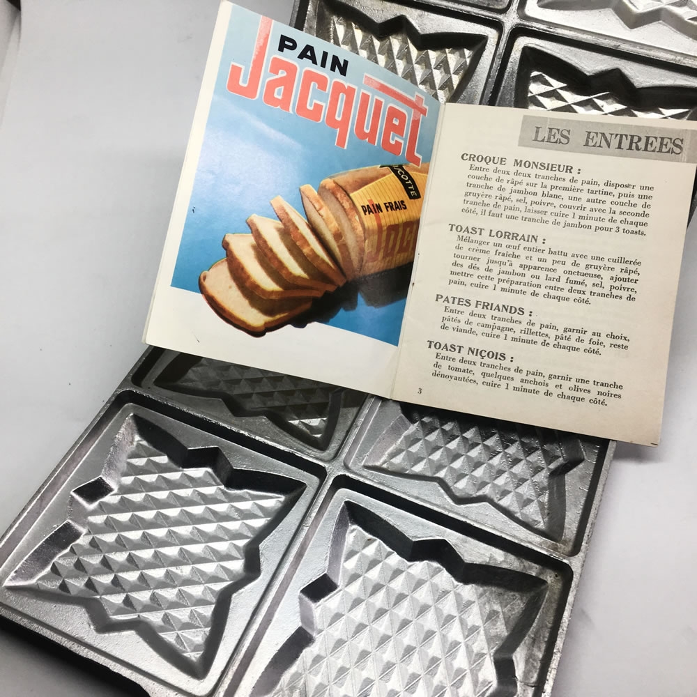 Quadruple croque-messieurs (!) en alu des années 50. En bon état, accompagné de son livret de recettes d'origine (les coupons de réduction pour le pain de mie qu'il contient ne sont vraisemblablement plus valables).