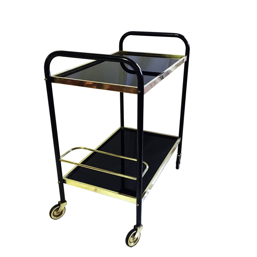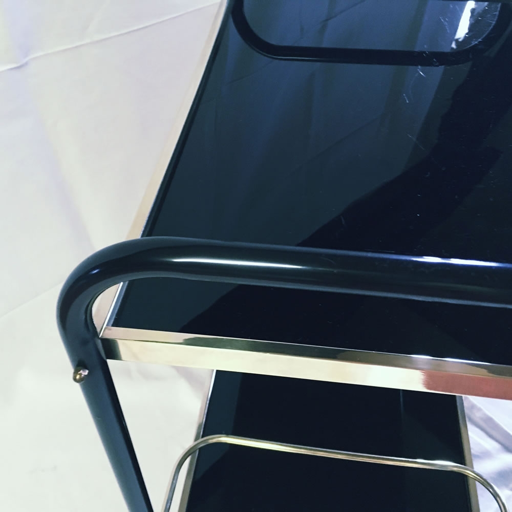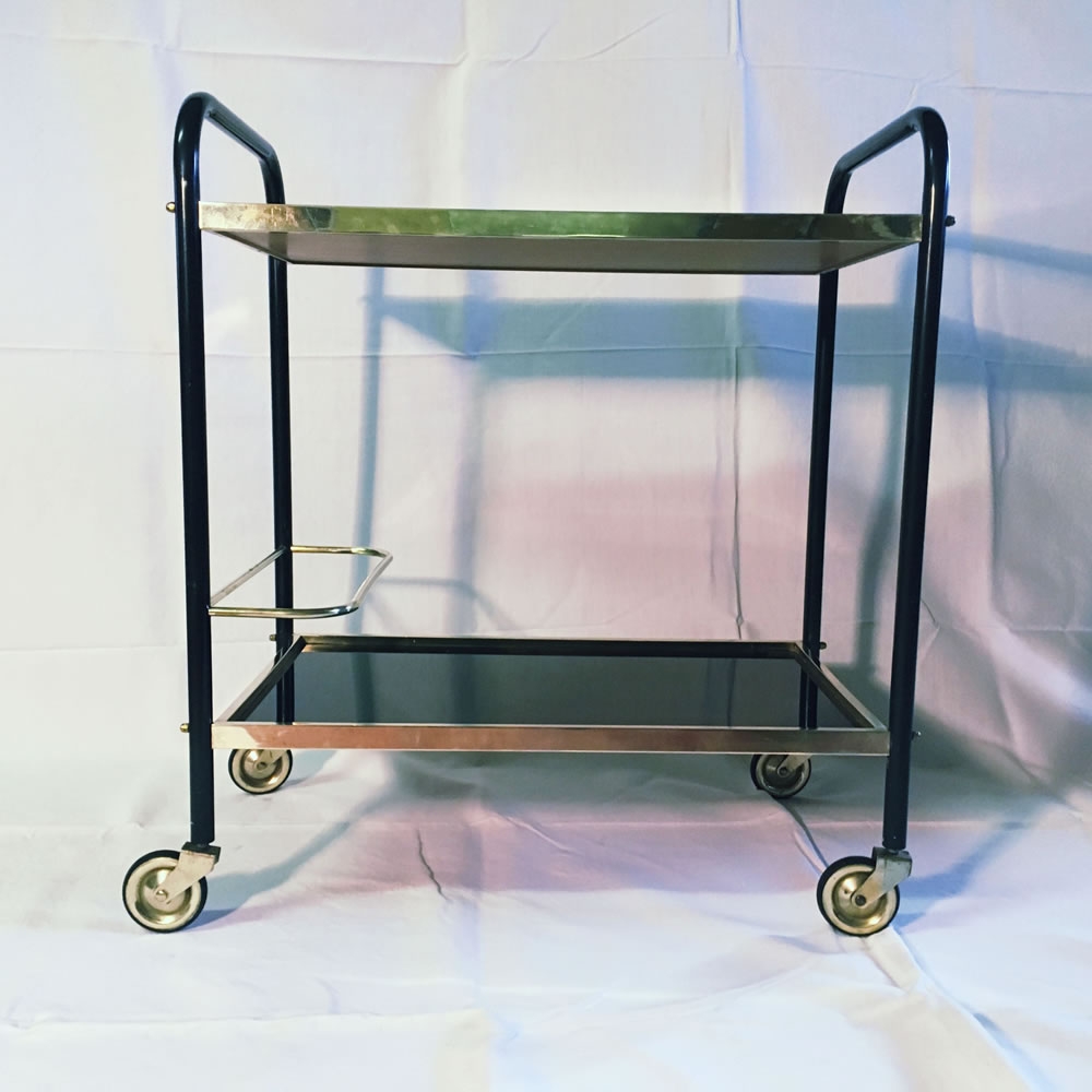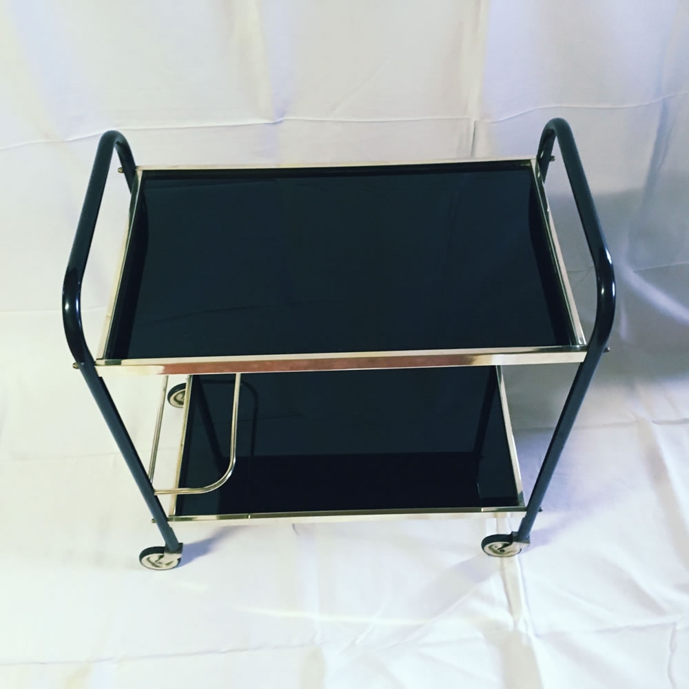 Desserte bar du début des années 60, en laiton, tube laqué noir et formica uni noir. Bon état d'usage.