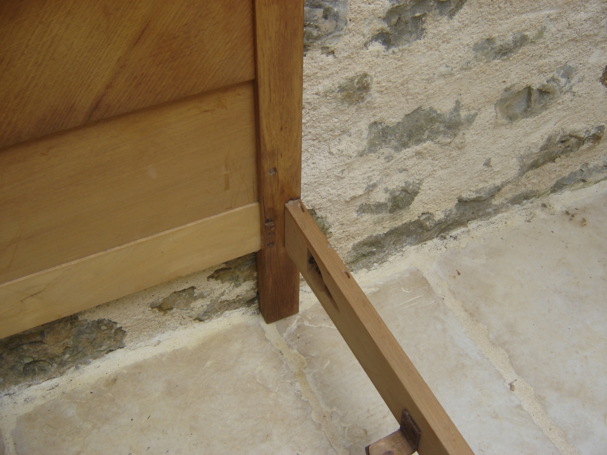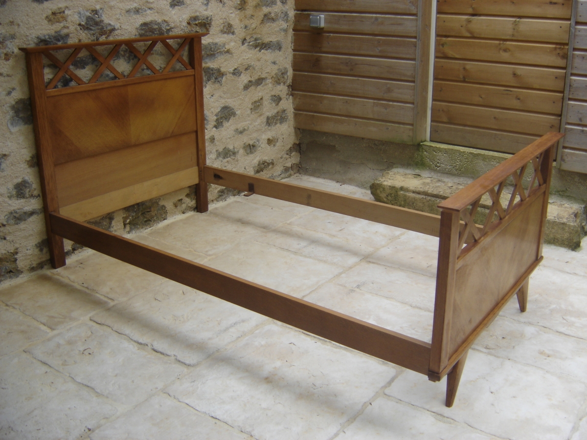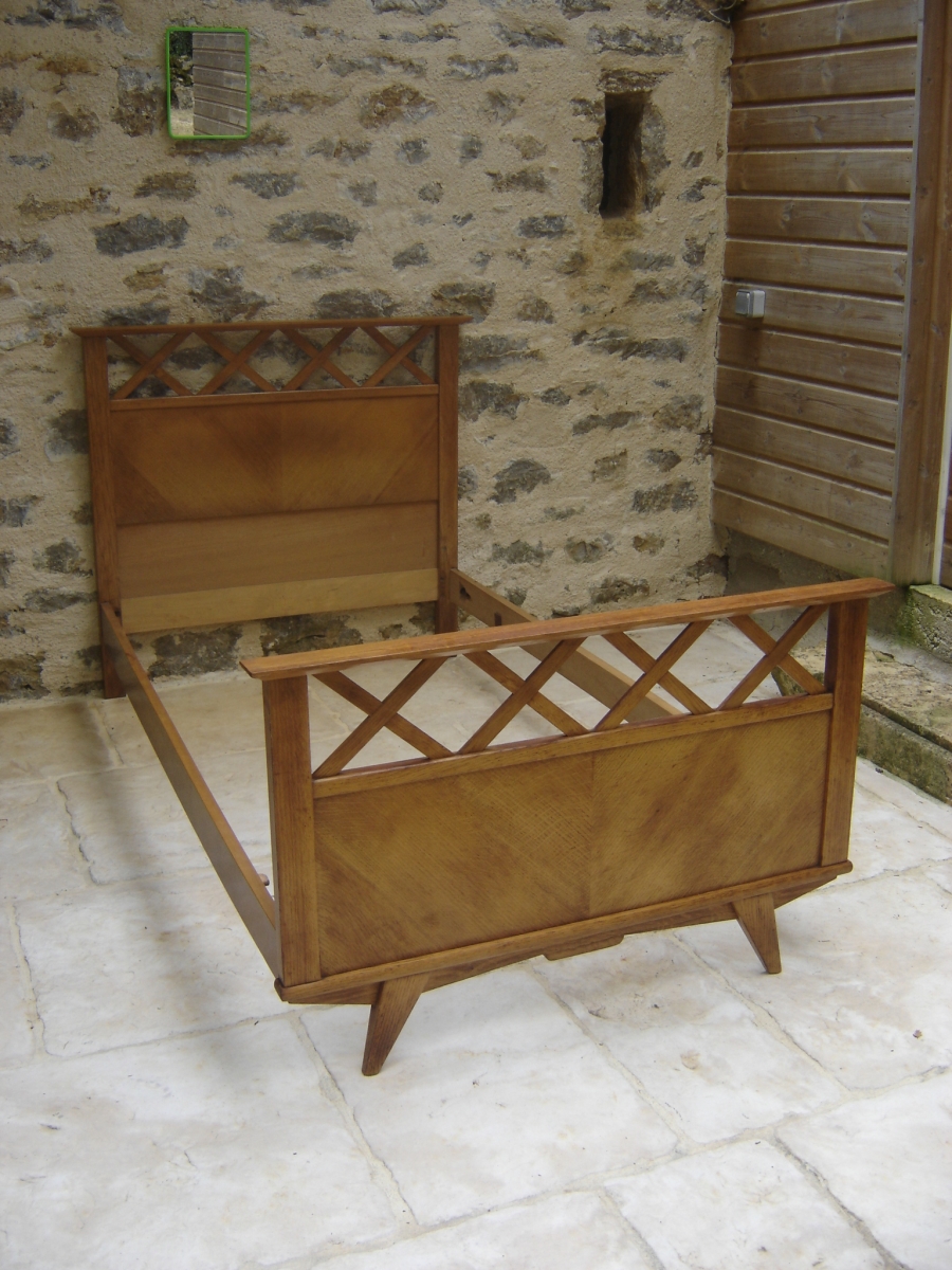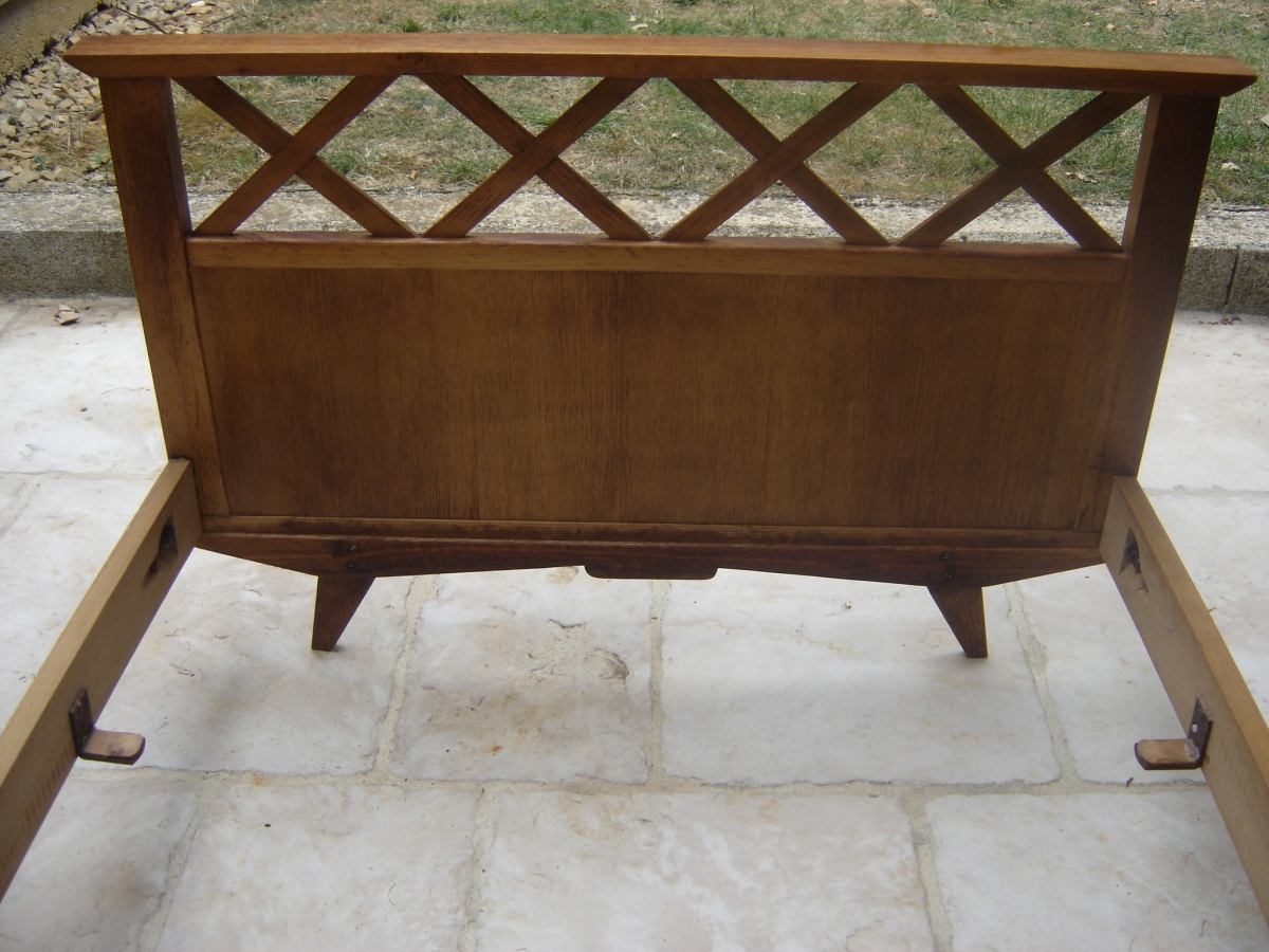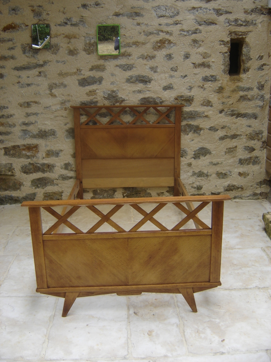 lit en chêne des années 50.Jolies lignes travaillées, arrondis aux angles.Traces du temps mais bon état de conservation Le lit se démonte et se remonte facilement grâce à un système de tenons/mortaises s'emboitant et de 4 vis.Hauteur tête de lit 103 cm, longueur 200 cm largeur 114 cm.Sommier et matelas non fournis Intérieur du lit 190 x 103 .