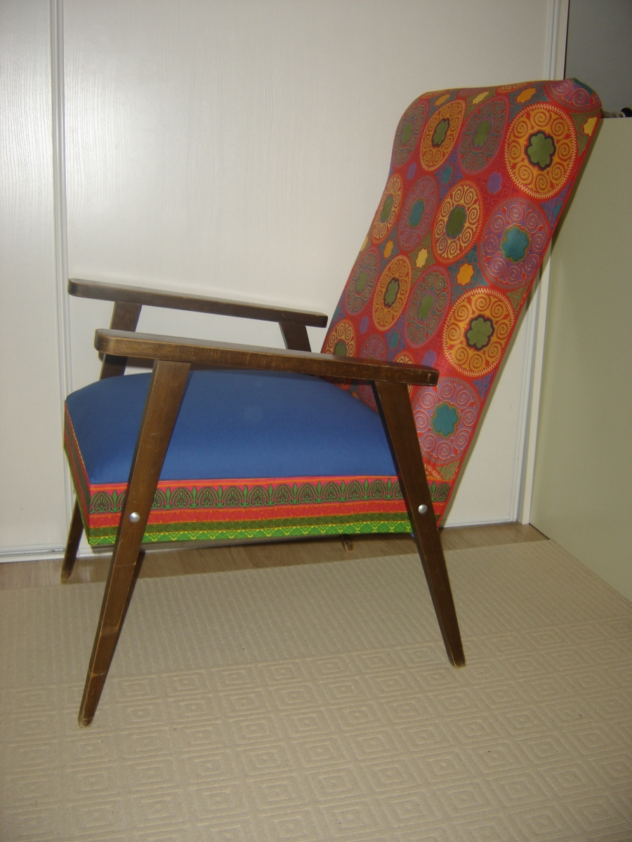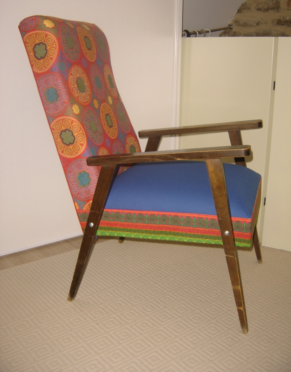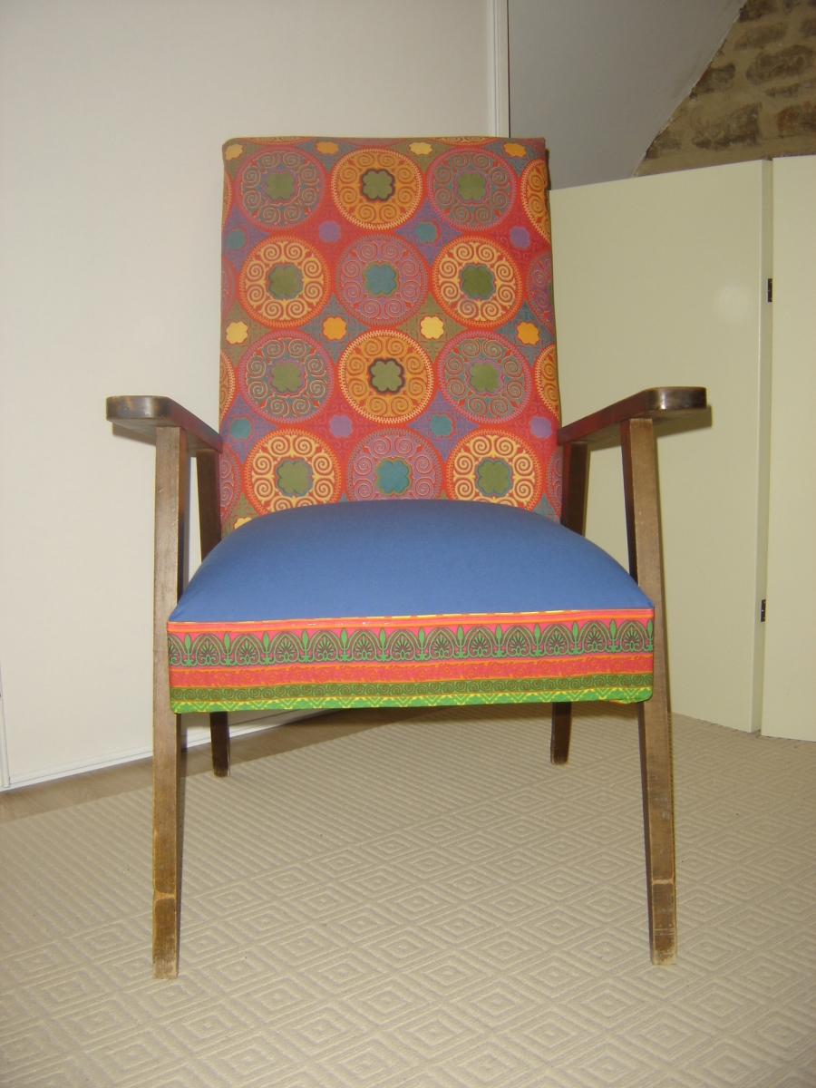 Fauteuil aux couleurs "joyeuses" , à l'allure scandinave.L'assise est en tissu de coton demi-nattée bleu azur ainsi que le dos du fauteuil, le galon et le dossier sont en tissu indien léger .Passepoil rouge. Le bois est dans son jus : traces d'usage .Assise 55 x 55 cm