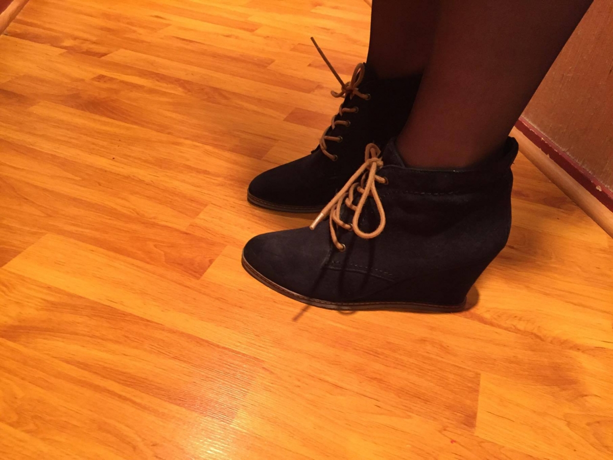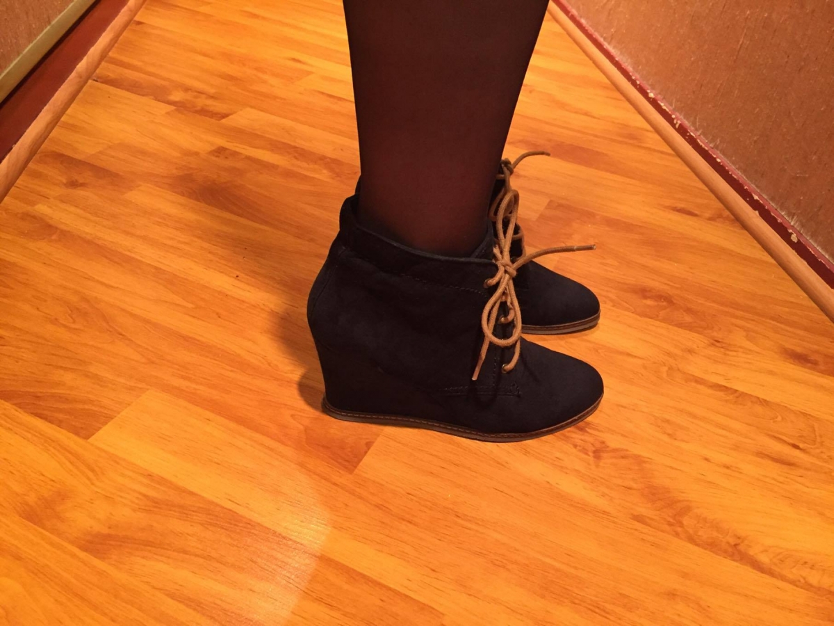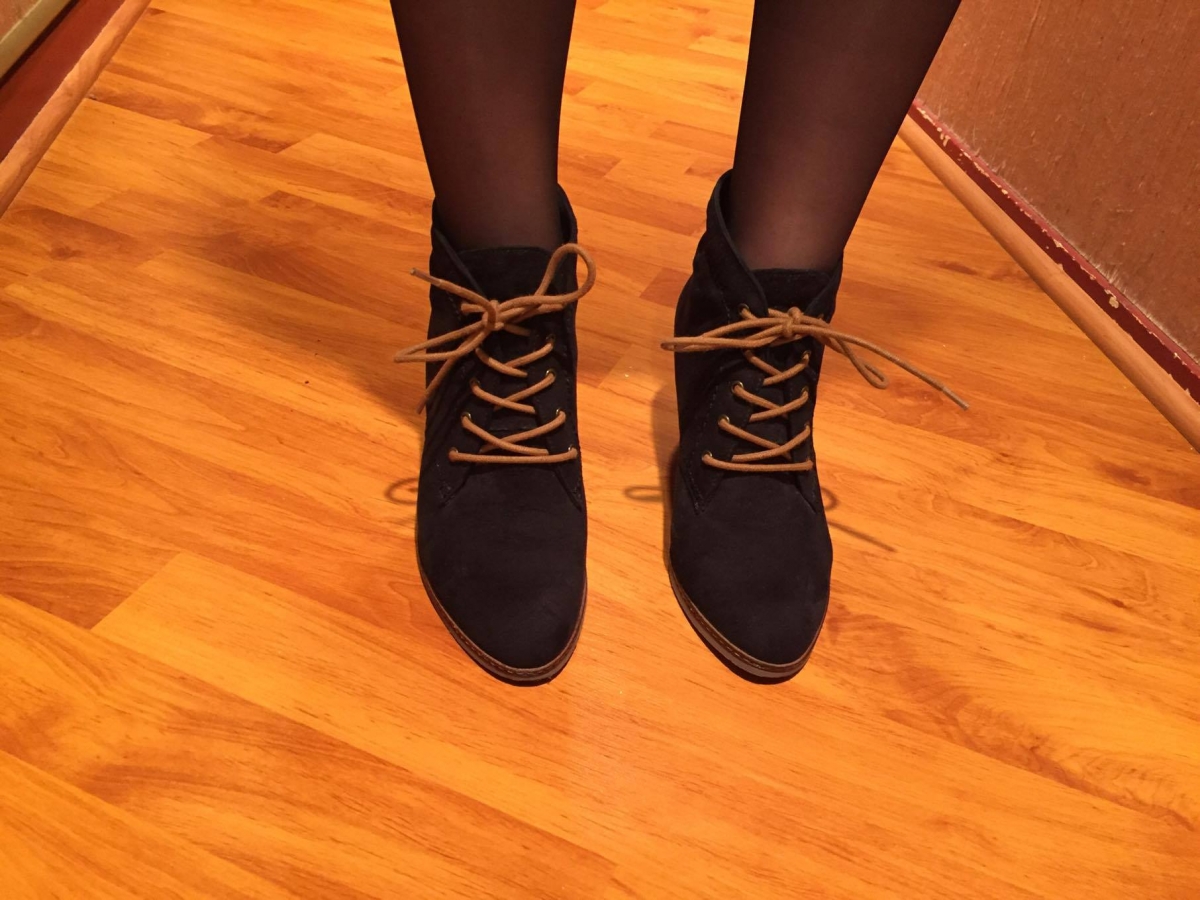 Bottines compensées à talons bleu marine / nuit avec des lacets marrons. Portées seulement quelques fois, je m'en sépare car plus à mon goût. Elles ont quelques traces d'usures sur les cotés avant.
