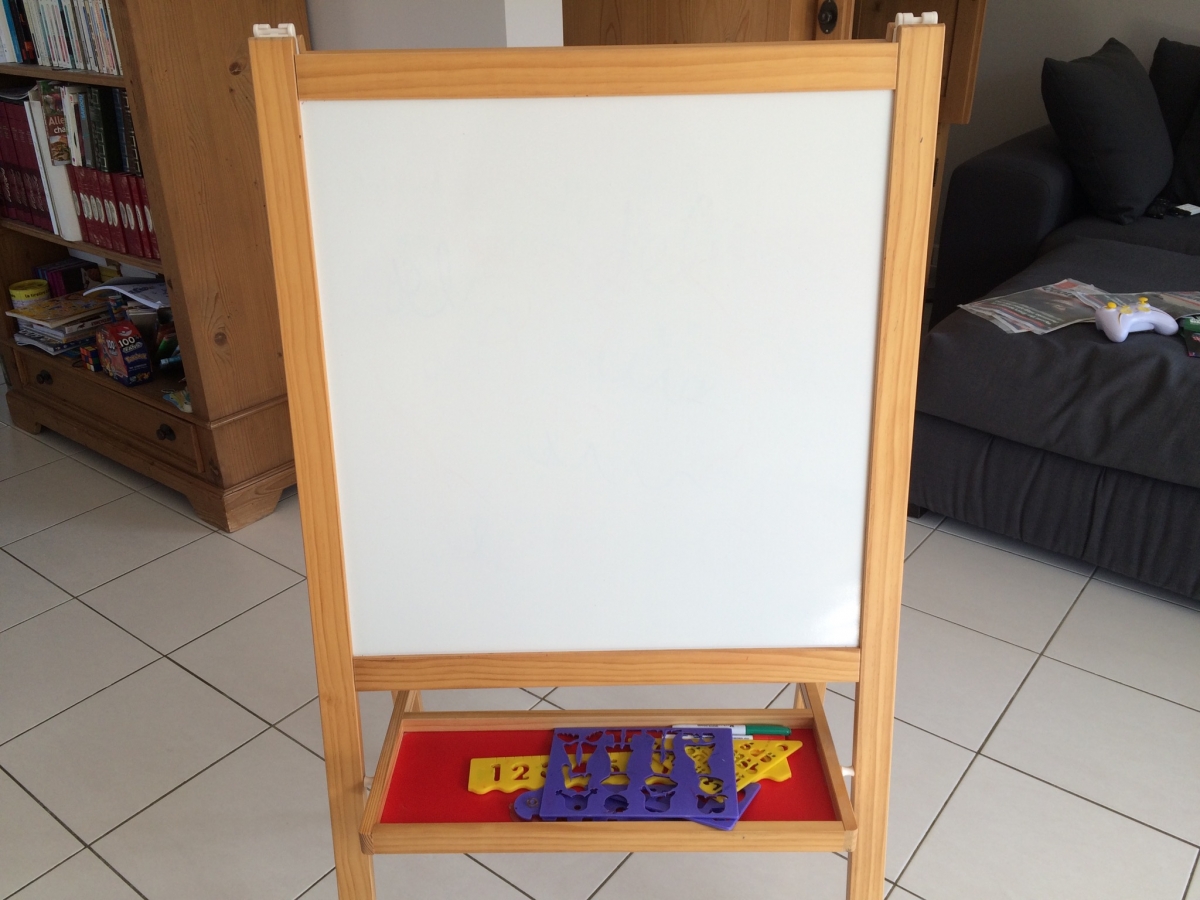 Tableau double face très bon etat, avec accessoires et tablette de rangement. Un coté noir et un coté Velleda.