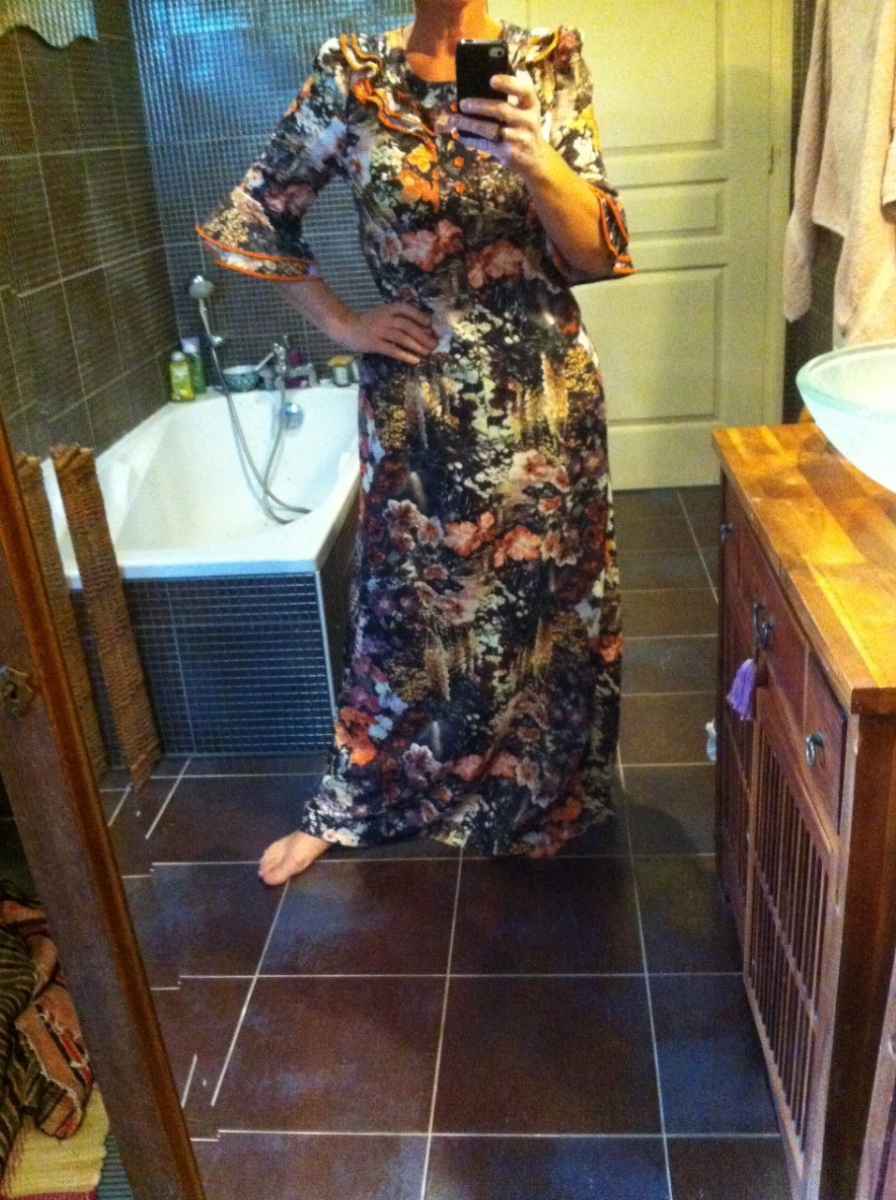 Longue robe fleurie vintage. Manches 3/4 à volants. Volants également sur la poitrine. Longueur 140cm (je mesure 1m65 et je suis pieds nus pour ne rien fausser) Largeur taille 38 cm Pas d'étiquette de taille ni de composition. Le tissu est malgré tt un peu épais et la robe peut parfaitement se porter avec des collants en hiver.