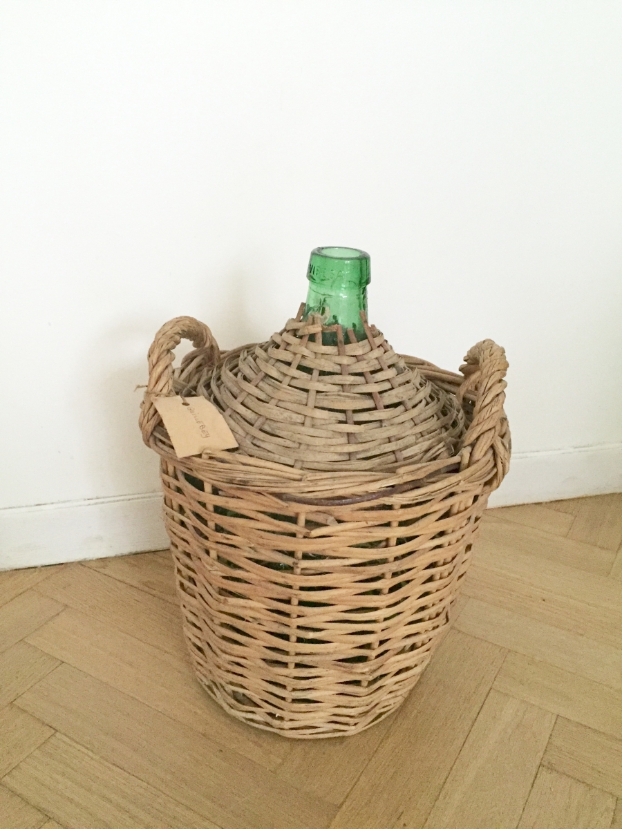 Dame Jeanne verte dans son panier osier